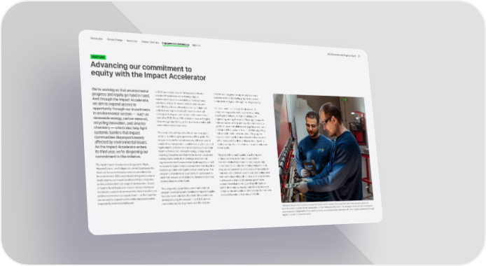 Introduction Climate Change Resources Smarter Chemistry Engagement and Advocacy Appendix 2023 Environmental Progress Report 73 Feature Advancing our commitment to equity with the Impact Accelerator We’re working so that environmental In 2022, our second class of the Impact Accelerator Every business is given the opportunity to attend a progress and equity go hand in hand. included 16 businesses at the leading edge of business executive leadership program focused on And through the Impact Accelerator, environmental services and solutions. Each company supply chain and growth through a leading university. we aim to expand access to selected is at least 51 percent owned, operated, and controlled by a Black-, Hispanic/Latinx-, or Indigenous Our most recent class featured a diverse set of opportunity through our investments individual and aligns closely with our environmental companies engaged in work on water stewardship, in environmental sectors — such as strategy, including our commitment to become carbon recycling technologies, and green building and renewable energy, carbon removal, neutral by 2030. M any of them share a focus on bringing engineering, among other areas. The program supports recycling innovation, and smarter clean energy, opportunity, and vital services to vulnerable these companies as they better position themselves for and underserved communities. growth, improve their abilities to engage larger contracts, chemistry — which also help fight and expand their customer base — all while supporting systemic barriers that impact The companies participate in a three-month program their commitment to the environment. The program communities disproportionately aimed at accelerating progress toward their goals. The has also connected like-minded business leaders, both affected by environmental issues. program includes live virtual sessions, online courses on within our Impact Accelerator classes and at Apple, to supply chain management, supplier diversity, financial and create new opportunities for innovation and to realize our As the Impact Accelerator enters legal subjects, and one-on-one mentorship with an Apple shared goals. its third year, we’re deepening our expert on topics from renewable energy to responsible commitment to this initiative. sourcing. Executives and their teams receive customized The goal of the Impact Accelerator is that Apple’s training that provides the knowledge and tools that strategic work and investments to protect the The Apple Impact Accelerator is designed for Black-, organizations need to succeed as Apple suppliers, as well environment also help expand access to opportunity Hispanic/Latinx-, and Indigenous-owned businesses that as access to Apple mentors and experts to help align their for communities of color. Since their participation in the share our focus on innovation and our commitment to business priorities with Apple’s environmental goals. The program, companies have seen increased recognition for the environment. With customized training and access to program culminates in an opportunity for participants to their work within their sector and local communities, have Apple experts, our Impact Accelerator helps companies pitch their services and solutions to decision makers and built connections with public- and private-sector leaders, as they achieve their next stage of development. As part business leaders within Apple. and have seen their overall business opportunities of Apple’s Racial Equity and Justice Initiative, the Impact expand. Several are currently working with Apple as Accelerator supports businesses that drive innovation and The companies sustain their commitment after the part of the company’s supply chain network, and every positive outcomes in our supply chain — so that together, program. Each participant transitions to Apple’s Supplier company has participated in selective opportunities to be we can work to support communities disproportionately Success community to further foster the connections assessed for potential business with Apple. impacted by environmental issues. developed during the program — and to forge new connections across all generations of the program. The Impact Accelerator’s goal is to ensure that Apple’s work to protect the environment also helps advance equity and expand access to opportunity for communities of color. Participants, like Bench-Tek, engage in online courses, live sessions, and mentorship throughout the three-month program, and continue their connection with other program participants through Apple’s Supplier Success community.