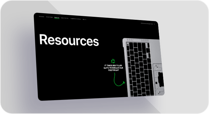 Apple Environmental | Immersive Page 30 Page 32Introduction Climate Change Resources Smarter Chemistry Engagement and Advocacy Appendix 2023 Environmental Progress Report 31 Resources It takes recycled guts to reduce our footprint