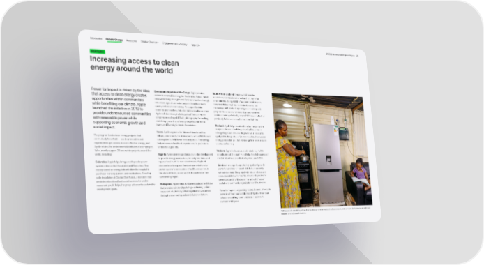 Introduction Climate Change Resources Smarter Chemistry Engagement and Advocacy Appendix 2023 Environmental Progress Report 25 FEATURE Increasing access to clean energy around the world Power for Impact is driven by the idea Democratic Republic of the Congo: Apple provides South Africa: Apple will fund new rooftop solar that access to clean energy creates access to renewable energy for the Malaika School, which installations at a vocational school and at a home for opportunities within communities empowers Congolese girls and their communities through senior citizens. Along with the four operational projects, while benefiting our climate. Apple education, agriculture, water projects, health outreach, these installations will reduce electricity costs, and sports, and vocational training. To support Malaika the savings will help fund operating costs and expand launched the initiative in 2019 to students and teachers, this solar initiative builds on other programs to support underserved groups. Apple will provide underresourced communities Apple collaborations, including virtual Today at Apple continue to bring electricity to over 3500 households that with renewable power while sessions on coding with Swift, photography, filmmaking, previously lacked access with local street lighting. supporting economic growth and and design, as well as other events with Apple Retail teams and Diversity Network Associations. Thailand: Apple helped establish a solar energy system social impact. to replace the use of polluting diesel fuel for a remote Israel: Apple supports the Nitzana Educational Eco- fishing village that relies on refrigerators to maintain the The program funds clean energy projects that Village, a community for at-risk youth, with a 260-kilowatt quality of its fish products. We increased local renewable are mutually beneficial — local communities and solar system to help lower electricity costs. The savings energy production and battery storage to improve reliable organizations get access to cost-effective energy, and help enhance educational experiences for youth from access to electricity. Apple retains the environmental attributes of each project. various backgrounds. We currently support 20 renewable projects around the Vietnam: Apple helps provide solar electricity for 20 world, including: Nigeria: A remote mini-grid project is under development schools around the country, and helps teach thousands of to provide energy access to community members and children about sustainable development and STEM. Colombia: Apple helps bring a rooftop solar power replace fossil fuels for some businesses. Apple will system online at the Hospital Infantil Santa Ana. The also continue to support the development of a solar Zambia: A microgrid supported by Apple will provide money saved on energy bills will allow the hospital to power system to serve primary healthcare centers in power to hundreds of households that are currently purchase more equipment and medications. A rooftop the state of Ondo, as well as 200 households in the without electricity. The project will reduce reliance and solar installation at Ciudad Don Bosco, a nonprofit that surrounding region. costs associated with imported diesel and gasoline for provides educational and social services for under- generators, and it will increase the amount of power resourced youth, helps the group advance its sustainable Philippines: Apple helps fund an educational institution available to community organizations and businesses. development goals. that provides scholarships to high-achieving, under- resourced students by offsetting electricity expenses Power for Impact is expanding access to clean, affordable through a new rooftop solar installation in Bataan. power in different parts of the world. Apple will continue to focus on uplifting communities as it pursues its environmental goals. With access to electricity in their homes through one of the South Africa projects, kids can now do homework at night and families can cook meals indoors.