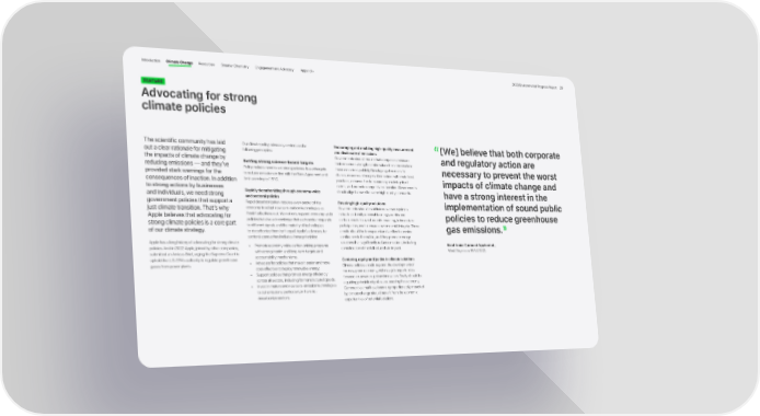 Introduction Climate Change Resources Smarter Chemistry Engagement and Advocacy Appendix 2023 Environmental Progress Report 29 FEATURE Advocating for strong climate policies The scientific community has laid Our climate policy advocacy centers on the Encouraging and enabling high-quality measurement [We] believe that both corporate out a clear rationale for mitigating following principles: and disclosure of emissions the impacts of climate change by Governments should require that companies measure and regulatory action are reducing emissions — and they’ve Setting strong science-based targets their emissions along the entire value chain and disclose Policy makers need to set strong science-based targets those emissions publicly. Developing clear rules for necessary to prevent the worst provided stark warnings for the to reduce emissions in line with the Paris Agreement and disclosure across all scopes of emissions will create best consequences of inaction. In addition limit warming to 1.5° C. practices, enhance the transparency and integrity of impacts of climate change and to strong actions by businesses claims, and promote competitive innovation. Governments and individuals, we need strong Rapidly decarbonizing through economy-wide should align to have the same high-quality standards. have a strong interest in the government policies that support a and sectoral policies Rapid decarbonization requires every sector of the Ensuring high-quality solutions implementation of sound public just climate transition. That’s why economy to adopt new zero-carbon technologies as Governments should establish or oversee systems Apple believes that advocating for fossil fuels phase out. We not only support economy-wide to track and verify renewable energy credits and policies to reduce greenhouse strong climate policies is a core part policies but also acknowledge that each sector responds carbon credits to avoid double-counting, to incentivize to different signals and the maturity of technologies participation, and to ensure environmental integrity. These of our climate strategy. to decarbonize them isn’t equal. Apple’s advocacy for credits should be transparent and verified to provide gas emissions. sectoral approaches includes these principles: confidence to the public, and they promote energy Apple has a long history of advocating for strong climate • Promote economy-wide carbon pricing programs solutions that significantly reduce emissions, including Brief Amici Curiae of Apple et al., policies. And in 2022 Apple, joined by other companies, with strong interim and long-term targets and consideration of the full value chain impact. West Virginia vs EPA (2022). submitted an Amicus Brief, urging the Supreme Court to accountability mechanisms. uphold the U.S. EPA’s authority to regulate greenhouse • Advocate for policies that make it easier and more Centering equity and justice in climate solutions gases from power plants. cost-effective to deploy renewable energy. Climate policies should support the development of • Support policies that promote energy efficiency the new green economy, with new job opportunities across all sectors, including for manufactured goods. focused on advancing clean innovation. Equity should be • Invest in mature and new zero-emission technologies a guiding principle of policies supporting this economy. to cut emissions, particularly in hard-to- Communities that have been disproportionately impacted decarbonize sectors. by climate change should benefit from the economic opportunities of potential solutions.