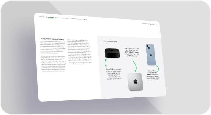 Introduction Climate Change Resources Smarter Chemistry Engagement and Advocacy Appendix 2023 Environmental Progress Report 16 Driving product energy efficiency while achieving more powerful performance. 13 The Product energy efficiency Product energy use accounts for 24 percent of our gross efficiency gains of the A15 Bionic chip eliminate the carbon footprint — and it has an impact on the individual need for an internal fan, resulting in a more compact energy use of each of our customers. This is why we’ve design and contributing to a 25 percent reduction in set aggressive targets to reduce our products’ energy carbon footprint over the previous generation. Through Over the course of a year, usage. We approach this challenge in the earliest phases our energy efficiency improvements, we’ve cut overall Mac Studio uses up to of design, taking a holistic view of each product — from product energy use across all major product lines by more than 70 percent since 2008. 14 And Apple products 1000 kilowatt-hours how efficiently the software operates to the power are consistently rated by ENERGY STAR, which sets less energy than a high- requirements of individual components. specifications that reflect the 25 percent most energy- end PC desktop. 18 With each generation of products, we strive to improve efficient devices on the market. In 2022, all eligible Apple energy efficiency. For example, the transition to Apple products received an ENERGY STAR rating for superior energy efficiency. 15 They also met the requirements for silicon on Mac devices continues to drive these EPEAT registration, 16 another environmental rating system improvements. The latest generation of our Pro chips is for electronic products, which considers energy efficiency enabling more Mac devices to run with improved energy and a number of other environmental topics. efficiency. For example, MacBook Pro with M2 Pro and M 2 M ax made significant progress in reducing energy use in 2022, and the new Apple TV 4K is designed to minimize its impact on the environment, using nearly Apple TV 4K is designed 30 percent less power than the previous generation to use nearly 30 percent iPhone 14 uses less power than the 57 percent less previous generation energy than the U.S. while achieving more Department of Energy’s powerful performance. 17 requirements for battery charger systems. 19
