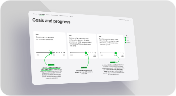 Introduction Climate Change Resources Smarter Chemistry Engagement and Advocacy Appendix 2023 Environmental Progress Report 8 Goals and progress Key Goal Goal Goal Achieved Become carbon neutral for Achieve carbon neutrality for our Transition our entire product value Ongoing our corporate operations. entire carbon footprint, including chain, including manufacturing and products, by 2030, reducing related product use, to 100 percent clean Not achieved emissions by 75 percent compared electricity by 2030. with 2015. 2010 2022 2030 2010 2022 2030 2010 2022 2030 GOAL GOAL Highlight Highlight As of March 2023, over 250 suppliers have Achieved carbon neutrality Highlight committed to transitioning to 100 percent since April 2020 by implementing renewable electricity for their Apple production, energy efficiency initiatives, sourcing Over 45 percent emissions with over 85 percent of Apple's direct 100 percent renewable electricity reduction since 2015 across our spend for materials, manufacturing, and for Apple facilities, and securing value chain. assembly of our products worldwide included carbon offsets for the remaining in those commitments. corporate emissions.