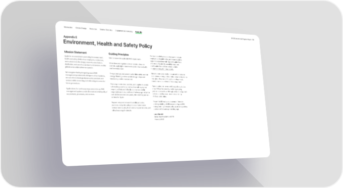 Introduction Climate Change Resources Smarter Chemistry Engagement and Advocacy Appendix 2023 Environmental Progress Report 109 Appendix E Environment, Health and Safety Policy Mission Statement Guiding Principles Communicate EHS policies and programs to Apple Apple Inc. is committed to protecting the environment, Meet or exceed all applicable EHS requirements. employees and stakeholders, and ensure suppliers health and safety (EHS) of our employees, contractors, operate in accordance with Apple’s Supplier Code and customers in the design, research, manufacture, Where laws and regulations do not provide adequate of Conduct. Supplier Responsibility resources distribution, and use of our products and services and the controls, apply higher standards to protect human health and Supplier Code of Conduct are available global communities where we operate. and the environment. at apple.com/supplier-responsibility . We recognize that by integrating sound EHS Design, manage, and operate our facilities safely, promote Strive to create products that are safe in their intended management practices into all aspects of our business, energy efficiency and renewable energy, and protect use, conserve energy and materials, and prevent pollution we can offer technologically innovative products and biodiversity and the environment. throughout the product life cycle, including design, services while conserving and enhancing resources for manufacture, use, and end-of-life management. future generations. Encourage contractors, vendors, and suppliers to provide Pursue continual improvement through the evaluation safe working conditions, treat workers with dignity and of our EHS performance by monitoring ongoing Apple strives for continuous improvement in our EHS respect, act fairly and ethically, use environmentally performance results and through periodic management management systems and in the environmental quality of responsible practices, and have effective programs for the reviews, as well as a commitment to correcting our products, processes, and services. control of environmental aspects, wherever they perform EHS nonconformities. services for Apple. Support and promote sound scientific principles, Ensure that all employees are aware of their role practices, and public policy initiatives that enhance and responsibility to fulfill and sustain Apple’s EHS environmental quality, health and safety performance, and management systems and policy by providing training ethical sourcing of materials. and tools in the user’s primary language. Luca Maestri Senior Vice President and CFO February 2023