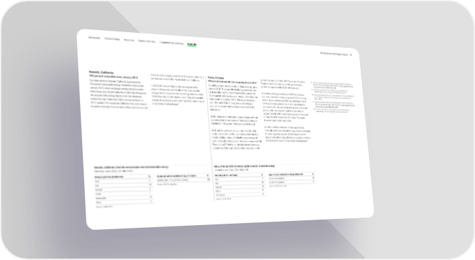 Introduction Climate Change Resources Smarter Chemistry Engagement and Advocacy Appendix 2023 Environmental Progress Report 91 Newark, California Direct Access to supply power from that project directly to Mesa, Arizona generating capacity of 4. 67 M W. The onsite PV system 8 Carbon emissions equivalences calculated using 2021 data from 100 percent renewable since January 2013 our data center and other Apple facilities in California. 100 percent renewable since opening March 2017 10 began commercial operation in February 2019 and the U.S. Energy Information Administration: www.eia.gov/electricity/ generates approximately 8, 000 M Wh per year. sales_revenue_price/pdf/table5_a.pdf . Our data center in Newark, California, is powered by Our global command data center in Mesa, Arizona, came 9 Emissions avoided are calculated using the GHG Protocol 100 percent renewable energy. We hit this milestone in In 2022, the Newark data center was supported by online in 2016. To support this facility, we partnered with methodology for calculating market-based emissions. January 2013, when we began serving the data center projects that generated 20 m illion kWh of renewable the local utility, the Salt River Project (SRP), to build the In addition, we began working with SRP to develop a 10 Apple took operational control of the building in October 2015 and energy, which is equivalent to the energy used by nearly customer renewable energy program in 2017, resulting converted it to a data center that began servicing customers in with energy sourced primarily from California wind power. 50-megawatt Bonnybrooke solar project, which became March 2 0 1 7. We acquired this energy directly from the wholesale 10,000 homes in California for a year. 8 Use of renewable operational in December 2016. This project produces in their Sustainable Energy Offering, which launched in 11 Carbon emissions equivalences calculated using 2021 data from market through California’s Direct Access program. In energy allowed us to avoid more than 804 m etric tons of over 148 million kWh of clean, renewable energy a 2019, to provide a diverse mix of commercial electric the U.S. Energy Information Administration: www.eia.gov/electricity/ sales_revenue_price/pdf/table5_a.pdf . 2017, Apple’s 130-megawatt California Flats solar project CO 2 e during the fiscal year. 9 year, which roughly matches the energy used by the customers with new renewable energy at an affordable 12 Emissions avoided are calculated using the GHG Protocol in nearby Monterey County came online, and now we use data center. price. Under this program, Apple has executed an methodology for calculating market-based emissions. agreement with SRP to purchase a portion of the output As the Mesa data center grew, it became apparent that of their 100 M W Central Line PV facility. The project we needed additional sources of renewable energy to became operational in April 2022. maintain our 100 percent renewable electricity goal. In 2022, the Mesa data center was supported by We began to explore onsite solar options at the data 379 m illion kWh of renewable energy, which is equivalent center and determined that we could provide valuable to the energy used by over 10,000 Arizona homes. 11 shaded parking that paid for itself through energy bill Use of renewable energy allowed us to avoid more than reductions while adding to our renewable energy portfolio. 158, 000 m etric tons of CO 2 e during the fiscal year. 12 The resulting PV facility includes five elevated parking canopies and three ground-mounted arrays, for a total Newark, California: Grid mix versus Apple-sourced renewable energy Mesa, Arizona: Grid mix versus Apple-sourced renewable energy Electricity use in 2022: 20 m illion kWh Electricity use in 2022: 379 m illion kWh Default grid mix (California) % Apple actual renewable energy allocation % Default grid mix (Arizona) % Apple actual renewable energy allocation % Coal
