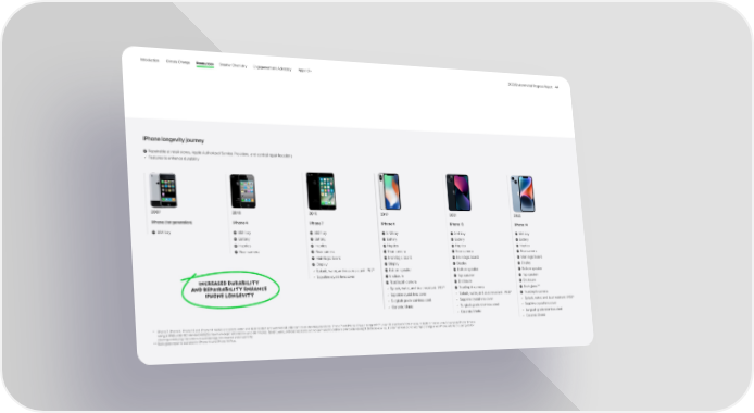 Introduction Climate Change Resources Smarter Chemistry Engagement and Advocacy Appendix 2023 Environmental Progress Report 44 iPhone longevity journey R epairable at retail stores, Apple Authorized Service Providers, and central repair locations F eatures to enhance durability 2007 2010 2016 2017 2021 2022 iPhone (1st generation) iPhone 4 iPhone 7 iPhone X iPhone 13 iPhone 14 SIM tray SIM tray SIM tray SIM tray SIM tray SIM tray Battery Battery Battery Battery Battery Haptics Haptics Haptics Haptics Haptics Rear camera Rear camera R ear camera Rear camera R ear camera Main logic board M ain logic board Main logic board M ain logic board Display Display Display Display S plash, water, and dust resistant: IP67* Bott om speaker Bottom speaker Bott om speaker Sapphir e crystal lens cover Enclosure Top speaker Top speaker Increased durability TrueDepth camera Enclosure Enclosure and repairability enhance S plash, water, and dust resistant: IP67* TrueDepth camera Back glass** iPhone longevity Sapphir e crystal lens cover S plash, water, and dust resistant: IP68* TrueDepth camera Sur gical-grade stainless steel Sapphir e crystal lens cover S plash, water, and dust resistant: IP68* Cer amic Shield Sur gical-grade stainless steel Sapphir e crystal lens cover Cer amic Shield Sur gical-grade stainless steel Cer amic Shield * iPhone 7 , iPhone X, iPhone 13 and iPhone 14 models are splash, water, and dust resistant and were tested under controlled laboratory conditions. iPhone 7 and iPhone X have a rating of IP67 under IEC standard 60529 (maximum depth of 1 meter up to 30 minutes). iPhone 14 has a rating of IP68 under IEC standard 60529 (maximum depth of 6 meters up to 30 minutes). Splash, water, and dust resistance are not permanent conditions and resistance might decrease as a result of normal wear. Do not attempt to charge a wet iPhone; refer to the user guide for cleaning and drying instructions. Liquid damage not covered under warranty. ** Back glas s repair is available for iPhone 14 and iPhone 14 Plus.