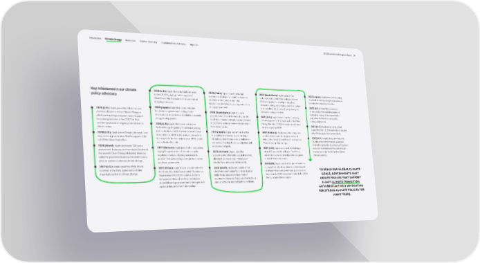 Introduction Climate Change Resources Smarter Chemistry Engagement and Advocacy Appendix 2023 Environmental Progress Report 30 Key milestones in our climate 2018 (U.S.): Apple filed individual comments 2018 (China): Apple submitted formal 2022 (South Korea): Apple spoke at the 2022 (Japan): Apple joined a letter calling policy advocacy to the U.S. EPA, urging it not to repeal the comments to China’s National Development carbon neutrality conference calling for Korea’s for a level of carbon pricing that provides an Clean Power Plan because of its importance in and Reform Commission about the 2030 energy plan to set a higher target for incentive for emissions reduction. reducing emissions. implications of draft policy on corporate clean renewable energy, a more fair competitive market 2022 (U.S.): Apple filed comments 2018 (Japan): Apple filed comments with energy procurement. for renewables, and improved transparency for to encourage more rapid integration of 2015 (U.S.): Apple joined the White House’s the Japanese government, calling for the 2018 (South Korea): Apple met with renewable energy solutions. renewable energy to the transmission American Business Act on Climate Pledge, in development of a robust and verifiable renewable government officials in Korea to discuss the 2021 (U.S.): Apple became the first company grid, a key bottleneck to renewable which participating companies voiced support energy trading system. need for increased renewable generation and to voice support for the enactment of the Clean energy deployment. for a strong outcome at the COP21 in Paris retail choice, whereby consumers can select Energy Standard (CES) that would decarbonize and demonstrated an ongoing commitment to 2018 (U.S.): Apple filed comments to the their power source. the power grid by 2035. 2022 (U.S.): Apple led an Amicus Brief climate action. Federal Energy Regulatory Commission, urging supporting the U.S. EPA’s authority to regulate 2016 (U.S.): Apple joined Google, Microsoft, and it not to finalize a rule that would subsidize fossil 2018 (Japan): Apple was among the first 2021 (Vietnam): Apple and other companies greenhouse gases from power plants. Amazon to sign an Amicus Brief in support of the fuels, which would limit the ability of renewables multinational companies to join the Japan vocalized our support to the government of 2022 (U.S.): Apple, along with Meta and U.S. EPA’s Clean Power Plan. to compete in the electricity market. FERC chose Climate Leaders’ Partnership, a coalition of Vietnam for the ambitious Power Development Google, advocated for greatly expanded not to finalize that rule. companies that align business objectives with Plan prioritizing clean energy. renewable generation to achieve a 70 percent 2016 (World): Apple addressed 700 senior 2017 (Vietnam): Apple joined other companies environmental goals. 2021 (U.S.): Apple was one of the first large, reduction in emissions in the state through government, business, and community leaders at urging the government of Vietnam to make 2019 (Vietnam): Apple urged the public U.S. companies calling on the SEC to intervention in the North Carolina Carbon the seventh Clean Energy Ministerial, where we regulatory changes allowing businesses to government to reform the electricity market, require disclosures of global greenhouse gases Plan proceeding. called for governments across the world to put a procure renewable energy through direct power allowing businesses to purchase power across all emissions scopes. price on carbon to address climate change. purchase agreements. directly from renewable power plants. 2017 (U.S.): Apple urged the White House 2020 (EU): Apple called on European leaders to to remain in the Paris Agreement and take 2017 (China): Apple hosted a roundtable with 2019 (World): Apple participated in the increase their climate ambition to achieve targets meaningful action on climate change. the Green Electricity Consumption Cooperative UN Environment Assembly and conducted of at least 55 percent greenhouse gas emissions To reach our global climate Organization (GECCO) to create a platform bilateral discussions with a number of reductions by 2030 and carbon neutrality by 2050. goals, governments must for buyers in China where they can discuss countries to advocate for policies that enable a The EU adopted these targets. create policies that support renewable energy procurement challenges and circular economy and bold action on climate. a just climate transition. opportunities and inform future policy. We've been actively advocating for strong climate policies for many years.