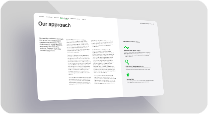 Introduction Climate Change Resources Smarter Chemistry Engagement and Advocacy Appendix 2023 Environmental Progress Report 58 Our approach We carefully consider the chemicals Smarter chemistry is our approach to identifying protect the environment. We’re working side by side with Our smarter chemistry strategy that we use in our products and chemicals that best serve all our priorities, including leading members of the scientific community, NGOs, and manufacturing processes. These safety, performance, and environmental impact. This industry organizations to move forward, and we continue choices directly impact the safety, supports our circular supply chain efforts by minimizing to push for the development and broad adoption of the recirculation of potentially harmful substances. Our safer alternatives. recyclability, and reuse of our efforts to remove potentially harmful chemicals from products, which are key to truly our products help create safer and healthier workplaces Our approach involves proactively promoting the use Mapping and engagement circular supply chains. for our employees and suppliers, and safe products for of smarter materials and chemicals. This involves Engage our supply chain partners to comprehensively identify the chemicals people and the environment. establishing safety requirements that often exceed local in the materials used to make our products and the processes used to make industry standards and empowering our suppliers to meet them, allowing us to drive change that goes beyond what’s required for Our approach to limiting potential chemical exposure our guidelines. We also help suppliers source materials regulatory compliance. in product manufacturing leverages the hierarchy of that are safer alternatives, which provide the necessary controls. The hierarchy of controls is a concept used to level of performance and are also better for people control hazard exposure and consists of five actions in and the environment. We have created standards and order of preference: elimination, substitution, engineering programs to support these efforts, including the rigorous controls, administrative controls, and personal protective requirements defined in our Regulated Substances equipment (PPE). Elimination and substitution are the Specification (RSS) and the deep supply chain most preferred forms of control. When no alternative is engagement through our Full Material Disclosure (FMD) Assessment and management available to eliminate or substitute potential exposure, and Chemical Safety Disclosure (CSD) programs. We also Assess the potential human health and environmental risks of chemicals to we rely on engineering and administrative controls share what we’ve learned in creating these systems with evaluate compliance with our requirements and inform product design. to safeguard against it. As we focus on this for our others in the industry — and we push for change that can manufacturing processes, we push our industry to do transform product manufacturing. the same. Advocacy and leadership are needed to make this We’ve taken the important initial step of accounting for happen. We’re committed to providing both this role, the materials that we use, both in our products and in pushing to broaden the use of safer and more sustainable the processes to create them. This information helps materials based on smarter chemistry — and working Innovation us better protect the people who design, make, use, with our suppliers and material manufacturers to create Drive the development and use of innovative materials that enable the creation and recycle our devices. It also informs our efforts to alternatives that can help move our industry forward. of groundbreaking products and support industry-wide change.
