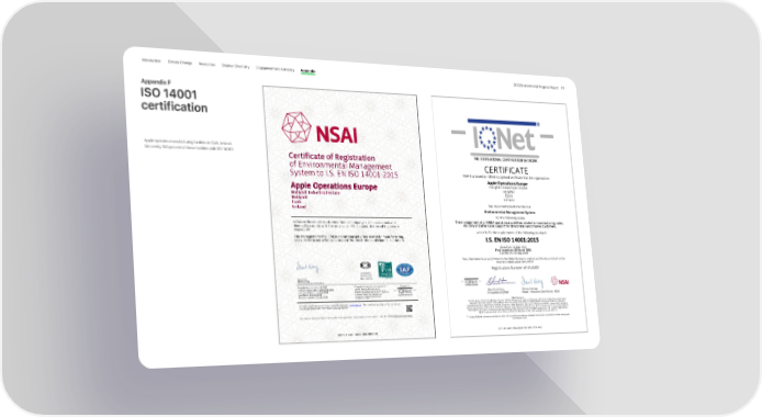 Introduction Climate Change Resources Smarter Chemistry Engagement and Advocacy Appendix 2023 Environmental Progress Report 111 Appendix F ISO 14001 certification Apple operates manufacturing facilities in Cork, Ireland. We certify 100 percent of these facilities with ISO 14001. Certificate of Registration of Environmental Management CERTIFICATE System to I.S. EN ISO 14001:2015 NSAI has issued an IQNet recognised certificate that the organisation: AAppppllee OOppeerraattiioonnss EEuurrooppee Hollyhill Industrial Estate AAppppllee OOppeerraattiioonnss EEuurrooppee Hollyhill Hollyhill Industrial Estate Cork Hollyhill Ireland Cork has implemented and maintains a Ireland EEnnvviirroonnmmeennttaall MMaannaaggeemmeenntt SSyysstteemm for the following scope: NSAI certifies that the aforementioned company has been assessed and TThhee mmaannaaggeemmeenntt ooff aallll EEMMEEAA ooppeerraattiioonnaall aaccttiivviittiieess rreellaatteedd ttoo mmaannuuffaaccttuurriinngg,, ssaalleess,, ddeelliivveerryy aanndd aafftteerr ssaalleess ssuuppppoorrtt ffoorr ddiirreecctt rreettaaiill aanndd cchhaannnneell ccuussttoommeerrss.. deemed to comply with the provisions of the standard referred to above in respect of:- which fulfils the requirements of the following standard: The management of all EMEA operational activities related to manufacturing, sales, delivery and after sales support for direct retail and channel customers II..SS.. EENN IISSOO 1144000011::22001155 IIssssuueedd oonn:: 1144 JJuullyy 22002211 FFiirrsstt iissssuueedd oonn:: 2200 MMaarrcchh 22000011 EExxppiirreess oonn:: 1100 JJuullyy 22002244 This attestation is directly linked to the IQNet Partner’s original certificate and shall not be used as a stand-alone document Registration Number: IE-14.0202 Approved by: Stewart Hickey Head - Business Excellence, NSAI This certificate remains valid on condition Registration Number: 14.0202 that the Approved Environmental Partner of Original Registration: 20 March 2001 ManagementSystemismaintained in an Last amended on: 14 July 2021 adequateand efficaciousmanner. NSAIis a Alex Stoichitoiu Stewart Hickey Valid from: 14 July 2021 partner of IQNet – the international President of IQNet Head–Business Excellence, NSAI Remains valid to: 10 July 2024 certification network (www.iqnet- certification.com) IQNet Partners*: All valid certifications are listed on NSAI’s website – www.nsai.ie. The continued validity of this certificate AENOR Spain AFNOR Certification France APCER Portugal CCC Cyprus CISQ Italy CQC China CQM China CQS Czech may be verified under “Certified Company Search” Republic CroCertCroatia DQSHoldingGmbHGermany FCAV Brazil FONDONORMAVenezuela ICONTECColombia Inspecta Sertifiointi Oy Finland INTECO Costa Rica IRAM Argentina JQA Japan KFQ Korea MIRTEC Greece MSZT Hungary Nemko AS Norway NSAIIreland NYCE-SIGEMéxico PCBCPoland Quality AustriaAustria RRRussia SII Israel SIQSlovenia SIRIM QAS International Malaysia SQS Switzerland SRAC Romania TEST St Petersburg Russia TSE Turkey YUQS Serbia NSAI (National Standards Authority of Ireland), 1 Swift Square, Northwood, Santry, Dublin 9, Ireland T +353 1 807 3800 E: [email protected] www.nsai.ie IQNet is represented in the USA by: AFNOR Certification, CISQ, DQS Holding GmbH and NSAI Inc. * The list of IQNet partners is valid at the time of issue of this certificate. Updated information is available under www.iqnet- * certification.com CERT-161 WM: 14001 2015 INAB (3) CERT-067.14001: MMA IQNet NSAI 14001 2015 A4 (1)