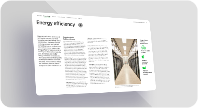 Introduction Climate Change Resources Smarter Chemistry Engagement and Advocacy Appendix 2023 Environmental Progress Report 17 Energy efficiency Our energy efficiency goals extend Operating Apple cooling systems. This retrospective view often enables Energy efficiency well beyond our products. We’re facilities efficiently us to increase cooling capacity of our existing facility, addresses focused on using less energy across thereby maximizing the amount of servers within our data emissions from: While our data centers, retail stores, and offices all use center footprint. our operations, beginning with how 100 percent renewable electricity, we are focused on we design, operate, and maintain reducing the energy we use in the first place. We consider In 2022, we further improved energy efficiency at data our facilities. And we continue these natural gas and electricity usage at each of these types of centers by deploying our own server design, developed same efforts into our supply chain. sites — as well as research and development facilities — with a focus on energy and computing efficiency, resulting auditing how we perform and, when needed, using in over 56. 7 m illion kilowatt-hours per year in energy Direct emissions Energy efficiency is also essential to best practices for energy management to reduce our savings. This work builds on previous efficiency efforts (scope 1) meeting our 2030 carbon neutrality loads. And we tailor the design of new buildings to our in our data centers, including developing a specification goal. So we track and monitor occupants’ and lab users’ specific needs. This approach requiring our servers to be powered by high-efficiency energy use across our operations helps us use our facilities efficiently and productively. power supplies — exceeding even the efficiency requirements for ENERGY STAR certification — which and supply chain, conducting audits Existing buildings: There are significant opportunities to was deployed to hundreds of thousands of servers in to find opportunities to work more save energy in retrocommissioning buildings that Apple 2021, resulting in over 4 m illion kilowatt-hours per year in Indirect efficiently. And we view our energy already occupies or operates, including energy-intensive energy savings. emissions use holistically, from the point of facilities like data centers. We audit the performance of buildings around the world, and then deploy identified New facilities: When designing new facilities, we (scope 2) design to the point of manufacture. reduction measures. Retrocommissioning focuses on incorporate energy efficiency principles early in the building controls to emphasize energy use reduction and process. We look at each location’s conditions, planning operational efficiency. We are prioritizing reducing natural for local temperature, humidity, and light. As each gas usage and replacing natural gas equipment with site becomes operational, we monitor how well we’re electrical equipment. While we’ve already transitioned to performing and make needed adjustments. For example, Product renewable electricity for our facilities, minimizing natural in designing our new campus in Austin, we put in a water- manufacturing gas is also an important element of working toward cooled air-conditioning system, rather than air-cooled, (scope 3) decarbonization. We are focused on reviewing and because of its increased energy efficiency. At the same benchmarking our most natural gas–intensive buildings to time, it was critical to consider the water stress of the look for reduction and fuel switching opportunities. area, therefore the cooling system will be supplied with recycled water, which will also be used for toilet flushing. Data centers: Data centers are traditionally energy- The first phase of our work on the Austin campus is intensive, requiring significant resources to cool the heat- saving 5. 7 m illion kilowatt-hours per year. generating equipment. That’s why we’re continuously monitoring and improving upon the controls for our Apple’s Reno data center, opened in 2012, takes advantage of the mild climate by cooling its servers with outside air whenever possible.