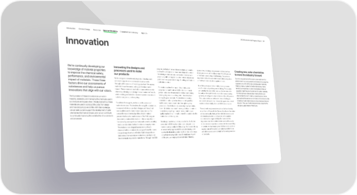 Introduction Climate Change Resources Smarter Chemistry Engagement and Advocacy Appendix 2023 Environmental Progress Report 64 Innovation We’re continually developing our Innovating the designs and program, we look at the conditions in which a material is approaches, including using cascade and counterflow Creating new, safer chemistries knowledge of material properties processes used to make used so that we can make recommendations that reflect rinsing processes, which helped retain 75 to 85 percent to move the industry forward to improve the chemical safety, our products the existing controls around a substance. And we work of the water used during metal finishing. This process proactively with our suppliers so that their employees are improvement has the potential to save millions of gallons Our strict requirements that govern potentially harmful performance, and environmental By focusing on materials early in product development, protected through proper storage, handling, and material of freshwater annually when applied at scale. substances in our products and processes encourage the impact of materials. These three we create opportunities to innovate improvements application controls. suppliers we work with to also prioritize safer materials, factors drive our assessments of throughout the process of creating a product. We assess In addition, we advanced our ability to recover acids helping create a market for better alternatives. We’re substances and help us pursue materials for performance, safety, and environmental Our work considers the impact of materials when used in chemical polishing and anodizing. These acids lending our expertise on safer chemistries to help our impact. These represent our holistic approach to smarter our products reach their end of life. We take steps to are typically discarded after one use, but we were able suppliers meet the growing demand for safer materials. innovations that align with our values. chemistry, allowing us to design for our customers’ needs prevent potential releases into the environment during to purify and recycle them back into the manufacturing Prioritizing these materials also means phasing out while creating products that exceed expectations and are the recycling process and to protect those involved process, reducing consumption by more than 90 percent . chemistries that don’t meet our specifications. We’ve The foundation of these innovations is our work in safer for use, reuse, and recycling. in recycling our products. This involves monitoring This approach has enabled us to reduce the largest approached this across our company and products while mapping, assessing, and managing the chemicals used in chemistries that may be harmless in small quantities source of solid waste from the anodizing process, and at investing in safer alternatives to drive change across our our products and supply chain. We also look at how these To achieve these goals, we focus on the process of but become more concentrated through recycling scale could potentially eliminate 4000 tons of waste. industry. The use of safer cleaners today supports the materials are used in a product life cycle, from design material selection. This involves choosing the substances processes. And it also entails assessing how potentially circular supply chains of the future. and manufacturing to end of life. With this knowledge, incorporated into our product designs and those that harmful substances impact the recyclability of a material The material and process innovations that we develop we can seek out and support the development of safer our suppliers use to manufacture our products. Our to avoid downcycling — use of the material in lower- result from all these efforts. Our work to share information chemistries that have an impact, and we can contribute comprehensive chemical profiles of each material quality applications — or substances that could make the across our supply chain, perform detailed process and to continually improving the overall safety of our products provide the basis for each decision. The FMD program material unsafe for any use. chemical assessments, and partner with suppliers and processes. documents material information — like composition — on chemical management lays the foundation for for review by our experts so that a substance’s suitability We also pursue innovation projects that lead to better improvements. We’re able to better protect those who meets our standards before it enters our supply chain. products. In 2019, we launched a pilot program at a make and use our products and enable the reuse of key This includes toxicological assessments of each manufacturing location in China as part of our anodizing materials. And by keeping harmful chemicals out of our chemical within a material, focusing on those that come improvement program with the aim of reducing, and supply chain at the outset, we make it possible for us into prolonged contact with skin. Each design choice eventually eliminating, potentially hazardous discharge, and others to recover materials for the next generation determines the materials included in our product and as well as reducing water and chemical use. As part of products. the chemicals required to make them. Through the CSD of the pilot, we employed several water efficiency