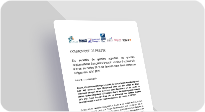 Six sociétés de gestion appellent les grandes capitalisations françaises à établir un plan d’actions afin d’avoir au moins 30 % de femmes dans leurs instances dirigeantes1 d’ici 2025