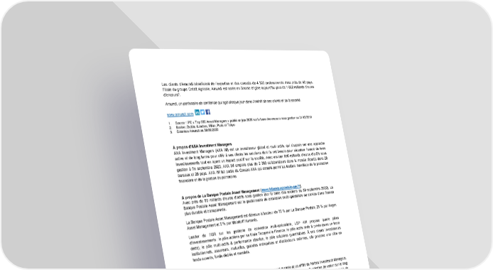 Les clients d’Amundi bénéficient de l’expertise et des conseils de 4 500 professionnels dans près de 40 pays. Filiale du groupe Crédit Agricol e, Amundi est cotée en Bourse e t gère aujourd’hui plus de 1 650 milliards d’euros d’encours 3 . Amundi, un partenaire de confiance qui agit chaque jour dans l’intérêt de ses clients et de la société. www.amundi.com 1. Source : IPE « Top 500 Asset M anagers » publié en juin 2020 sur la base des encour s sous gestion au 31/12/2019 2. Boston, Dublin, Londres, Milan, Paris et Tokyo 3. Données Amundi au 30/09/2020 A propos d'AXA Investment Managers AXA Investment Managers (AXA IM) est un investisseur global et multi actifs, qui s’appuie sur une approche active et de long terme pour offrir à ses clients les solutions dont ils ont besoin pour séc uriser l’avenir de leurs investissements tout en ayant un impact positif sur la société. Avec environ 830 milliards d’euros d’actifs sous gestion à fin septembre 2020, AXA IM emploie plus de 2 360 coll aborateurs dans le monde répartis dans 28 bureaux et 20 pays. AXA IM fait partie du Groupe AXA qui compte parmi les leaders mondiaux de la protection financière et de la gestion de patrimoine. A propos de La Banque Postale Asset Management ( www.labanquepostale-am.fr ) Avec près de 50 milliards d’euros d’actifs sous gestion (sur la base des encours au 30 septembre 2020), La Banque Postale Asset Management est le gestionnaire de convicti on multi-spécialiste au service d'une finance plus durable et transparente. La Banque Postale Asset Managem ent est détenue à hauteur de 70 % par La Banque Postale, 25 % par Aegon Asset Management et 5 % p ar Malakoff Humanis. Leader de l’ISR sur les gestions de conviction multi-spécialist e, LBP AM propose quatre pôles d'investissements : le pôle actions par sa filiale Tocqueville Finance, le pôle actifs réels & privés (avec un focus dette), le pôle multi-actifs & performance absolue, le pôle sol utions quantitatives. À se s clients investisseurs institutionnels, assureurs, mutuel les, grandes entreprises et d istributeurs externes, elle propose une offre en fonds ouverts, fonds dédiés et mandats. A propos de Mirova Mirova est une société de gestion dédiée à l’investissement dur able et un affilié de Natixis Investment Managers. Grâce à sa gestion de conviction, l’objectif de Mirova est de c ombiner recherche de création de valeur sur le long terme et développement durable. P ionniers dans de nombreux doma ines de la finance durable, les talents de Mirova ont pour ambition de continuer à innover afin de propose r à leurs clients des solutions à fort impact environnemental et social. Mirov a gère 15,8 Milliards d’euros à fin septembre 2020. Société de gestion de portef euille - Société Anonyme RCS Paris n°394 648 216 - Ag rément AMF n° GP 02-014 59, Avenue Pierre Mendes France – 75013 - Paris Mirova est un affilié de Na tixis Investment Managers. > En savoir plus : www.mirova.com > Suivre Mirova sur : A propos d’Ostrum Asset Management Ostrum Asset Management a pour mission de prolonger les engagem ents de ses clients par l’investissement et de contribuer, à leurs côtés, à a ssurer les projets de vie, la santé et la retraite des citoyens européens. Parmi les leaders européens 1 de la gestion institutionnelle, Ostrum Asset Management accomp agne ses clients opérant avec des contraintes de passif, en leur proposant une o ffre duale : la gestion d’actifs, avec son expertise