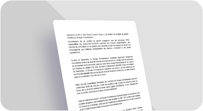 aujourd’hui le 30 % Club France Investor Group », ont déclaré les sociétés de gestion membres du Groupe d’Investisseurs. Concrètement, les six sociétés de gestion engageront avec les e ntreprises (PDG, responsables des ressources humaines, membres des Conseils d’ad ministration, des Comités de nomination) sur la question de la diversité au sein des équipes de direction et encourageront une meilleure représentation des femmes, notammen t à des postes opérationnels. Au-delà du leadership, le Groupe d’Investisseurs souhaitera éga lement comprendre comment les critères de diversité femmes-hommes sont pris en co mpte dans les processus de recrutement et de promotion jusqu’aux plus hauts niveaux hié rarchiques et ce, dans le but d’assurer la création d’un vivier de talents suffisamment d iversifié à tous les échelons de l’entreprise. Le Groupe d’Investisseurs s’assurera, par aill eurs, que les entreprises se sont fixé des objectifs clairs en termes de diversité femmes-ho mmes et qu’un plan d’actions visant à les atteindre a bien été mis en place. Enfin, lors des Assemblées Générales, les membres du Groupe d’I nvestisseurs pourront utiliser leurs droits de vote pour inciter les sociétés à agir lorsque les mesures prises en faveur de la diversité femmes-hommes seront jugées insuffisante s et que l'engagement avec la société n'aura abouti à aucun résultat satisfaisant. Avec six membres à ce jour, le Groupe d’Investisseurs souhaite élargir sa composition. Les sociétés de gestion qui investissent dans des sociétés du SBF 1 20, qu’elles soient basées en France ou à l’étranger, ainsi que les investisseurs institut ionnels sont invités à rejoindre le 30 % Club France Investor Group dans les prochains mois. « Le 30 % Club Investor Group a été lancé dans cinq pays (Australie, Brésil, Canada, Japon, Royaume-Uni) et nous sommes heureux de pouvoir désormais porter une voix collective autour de la diversité femmes-hommes en France. Notre stratégie continuera d’évoluer dans le temps et nous espérons que les entreprises du SBF 120 répondront positivement à nos demandes d’échanges afin que nous puissions les accompagner au mieux dans cette transition », ont déclaré Marie Fromaget, Patrick Haustant et Molly Minton, co-présidents du 30 % Club France Investor Group. Liste des membres du 30 % Club France Investor Group au 09/11/2 020 : Le Groupe d’Investisseurs est co-présidé par : Amundi : Patrick Haustant et Molly Minton, Analystes ESG AXA Investment Managers : Marie Fromaget, Analyste Capital Hum ain et Diversité Le Groupe d’Investisseurs compte également parmi ses membres : La Banque Postale Asset Management (LBP AM) : Léa Bozzi, Analy ste ISR Mirova : Eva Lhomme, Analyste ESG