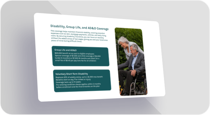 Disability, Group Life, and AD&D Coverage This coverage helps maintain financial stability, covering essential expenses such as rent, mortgage payments, utilities, and daily living costs. By securing disability insurance, you can focus on recovery without the added stress of lost wages, giving you and your loved ones peace of mind during difficult times. $20,000 benefit at no cost to eligible employees Spouse coverage of $7,500 and child coverage of $2,000 (under 6 months) or $7,500 (6 months and older) for a small fee of $0.45 per pay (one fee for all children) Group Life and AD&D Replaces 65% of weekly salary, up to a $1,200 max benefit Benefits start on day 7 for illness or injury Coverage lasts up to 14 weeks Pre-existing condition clause applies within 3 months before enrollment and the first 6 months on the plan Voluntary Short-Term Disability