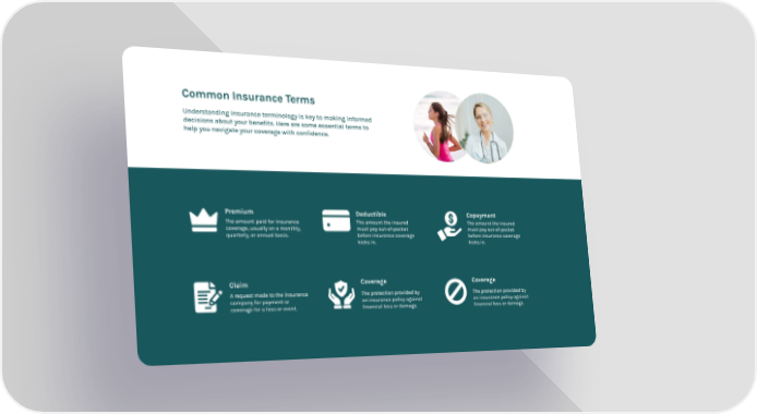 Common Insurance Terms Understanding insurance terminology is key to making informed decisions about your benefits. Here are some essential terms to help you navigate your coverage with confidence. Premium The amount paid for insurance coverage, usually on a monthly, quarterly, or annual basis. Claim A request made to the insurance company for payment or coverage for a loss or event. Deductible The amount the insured must pay out-of-pocket before insurance coverage kicks in. Coverage The protection provided by an insurance policy against financial loss or damage. Copayment The amount the insured must pay out-of-pocket before insurance coverage kicks in. Coverage The protection provided by an insurance policy against financial loss or damage.