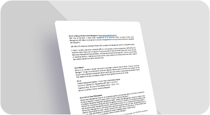 About La Banque Postale Asset Management ( www.labanquepostale-am.fr ) With close to €50 billion in assets under management (at 30 Sep tember 2020), La Banque Postale Asset Management (LBP AM) is a multi-specialist conviction management firm working to make finance more sustainable and transparent. LBP AM is 70%-owned by La Banq ue Postale, 25% by Aegon Asset Ma nagement and 5% by Malakoff Humanis. A leader in socially responsible investment (SRI) for multi-spe cialist conviction management, LBP AM has four investment desks: Equity via its Tocqueville Finance subsidiary , Property & Private Assets (with a focus on debt), Multi-assets Management & Absolute Return, and Quantitative Inv estment Management. It serves a customer base of institutional investors, traditional and mutual insurers, la rge companies and external distributors with a range of open-ended, dedicated and advisor-directed funds. About Mirova Mirova is an investment manager dedicated to responsible invest ment and an affiliate of Natixis Investment Managers. Through a conviction-dr iven investment approach, Miro va’s goal is to combine value creation over the long term with sustainable development. Mirova’s talents have b een pioneers in many areas of sustainable finance. Their ambition is to keep innovating to propose the most impact ful solutions to their clients. Mirova Portfolio management company – F rench Public lim ited liability company RCS Paris n°394 648 216 - Regula ted by AMF under n° GP 02-014 Registered Office: 59, Avenue Pie rre Mendes Franc e – 75013 - Pa ris Mirova is an affiliate of Natixis Investment Managers. About Ostrum Asset Management Ostrum Asset Management draws on its investment expertise to en hance the impact of its clients’ commitments as they act together to support E uropean citizens ’ life plans, health and retirement. A European institutional investment management leader 1 , Ostrum Asset Management supports its clients in their liability-driven investments, offering both asset management so lutions on the back of its long-standing fixed-income and insurance-related management expertise, and investment serv ices via its innovative technological platform. Ostrum Asset Management is a well-established responsible inves tment advocate 2 and manages €430 billion 3 in assets for large institutional clients – insurers, pension fund s, health insurers, corporations – as well as €590 billion 3 in assets under administration fo r professional investors world wide across all asset classes. Ostrum Asset Management is an a ffiliate of Natixis Investment M anagers. 4. IPE Top 500 Asset Managers 2020 ranked Ostrum AM as the 77 th largest asset manager, as at 12/31/2019. Any reference to a ranking, a rating or an award provides no guarantee for fu ture performance. 5. Ostrum AM was one of the fi rst French asset manager signator ies to the PRI in 2008. More details; www.unpri.org 6. Source: Ostrum Asset Management, consolidated data at end-Se ptember 2020. Administered assets include Ostrum AM's assets. The services provided for a given client may concern ce rtain services only. About Sycomore Asset Management Founded in 2001, Sycomore Asset Management is an asset manager specialised in sustainable listed investments and driven by a strong entrepreneur ial spirit. Since its creat ion, Sycomore has been committed to delivering long- term returns by identifying the levers that enable a company to generate sustainable value. The firm’s expertise draws on a fieldwork approach and a propri etary corporate fundamental analysis model, which includes financial and extra-financial criteria. Its team of 22 analysts-fund managers, inc luding 9 ESG specialists (Environment, Social and Governance) focus on assessing the ove rall performance of a company with respect to its stakeholders: shareholders, c lients, employees, suppliers, civil society and the environment. Since 2015, Sycomore AM has br oadened its range of investment s olutions with funds with a strong social, societal and environmental contribution. More recently, in collaboration with Quantis and I Care & Consult, it launched the NEC Initiative, an open-source collaborative platform dedicated to the NEC, for Net Env ironmental Contribution, which measures the degree of alignment of a product or service, project, company, portfolio or index with the ecological transition: www.nec-initiative.org.