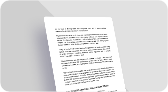 on the issue of diversity within the management teams and will encourage better representation of women, especially in operational roles. Beyond leadership, the Group will also want to understand how t he criteria of gender diversity is considered in the recruitment and promotion process at all l evels of the corporate hierarchy, with the aim of ensuring the creation of a sufficiently diverse talent pool across the entire company. The Group will also ensure that companies have set cle ar goals relating to gender diversity and that an action plan has been put in place to achi eve them. Finally, during the Annual General Meetings, Group members will be able to use their voting rights to encourage companies to take concrete actions when the measures taken in favour of gender diversity are considered insufficient and the engagem ent with the company wouldn’t have led to a satisfactory result. With six members to date, the Group wishes to expand its member ship. Asset management companies that invest in SBF 120 companies, whether based in Fr ance or abroad, as well as institutional investors, are invited to join the 30% Club Fr ance Investor Group in the coming months. “The 30% Club Investor Group has been launched in five countries (Australia, Brazil, Canada, Japan, United Kingdom) and we are pleased to now also be able to bring a collective voice around gender diversity in France. Our strategy w ill continue to evolve over time and we hope that the SBF 120 companies will respond positively to our requests for dialogue so that we can best support them in this transition,” said Marie Fromaget, Patrick Haustant and Molly Minton, who co-chair the 30% Club France Investor Group . List of the 30% Club France Investor Group members as at 09/11/ 2020: The Group is co-chaired by: Amundi: Patrick Haustant and Molly Minton, ESG Analysts AXA Investment Managers: Marie Fromaget, Human Capital and Div ersity Analyst The Group also counts among its members: La Banque Postale Asset Management (LBP AM): Léa Bozzi, SRI An alyst Mirova: Eva Lhomme, ESG Analyst Ostrum Asset Management: Corinne Gaborieau, Research and SRI d epartment Sycomore Asset Management: Sabrina Ritossa Fernandez and Sara Carvalho de Oliveira, ESG Analysts END NOTES TO EDITORS About the 30 % Club Investor Group : The 30 % Club Investor Group was created in 2011 in the UK. Its objectives are the following: co-ordinate the investment community’s approach to diversity, in particular to explain the investment case for more diverse boards and senior management t eams;