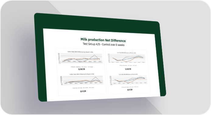 This document analyzes the milk production net difference in a Test Group A/B control study over 8 weeks, featuring weekly data comparisons for heifers and cows.