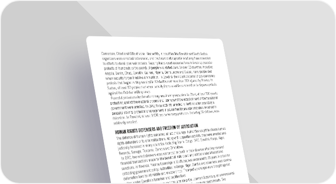 Cameroon, Chad and Côte d’Ivoire. Meanwhile, in countries like Eswatini and South Sudan, organizers were arrested beforehand, and the internet disrupted in what may have amounted to efforts to derail planned protests. Security forces used excessive force to break up peaceful protests of hundreds or thousands of people who defied bans. In over 12 countries, including Angola, Benin, Chad, Eswatini, Guinea, Nigeria, Sierra Leone and Sudan, many people died when security forces fired live ammunition. In Eswatini, the violent dispersal of pro-democracy protests that began in May resulted in 80 deaths and more than 200 injuries by October. In Sudan, at least 53 people died when security forces used live ammunition to disperse protests against the October military coup. Peaceful protesters also faced arbitrary arrest and prosecution. In Chad, at least 700 people protesting against the electoral process and later against the establishment of the transitional government were arrested. In DRC, three activists arrested in North Kivu for organizing a peaceful sit-in to protest mismanagement in a local healthcare administration remained in detention. In Eswatini, at least 1,000 pro-democracy protesters, including 38 children, were arbitrarily arrested. HUMAN RIGHTS DEFENDERS AND FREEDOM OF ASSOCIATION The defence of human rights remained an act of courage. Authorities sought to silence human rights defenders or to criminalize them. Along with opposition activists, they were arrested and judicially harassed in many countries, including Benin, Congo, DRC, Eswatini, Kenya, Niger, Rwanda, Senegal, Tanzania, Zambia and Zimbabwe. In DRC, two whistleblowers were sentenced to death in their absence after they revealed financial transactions made for the benefit of individuals and entities under international sanctions. In Rwanda, Yvonne Idamange, a YouTuber, was sentenced to 15 years in prison for criticizing government policy. Authorities in Congo, Niger, Zambia and elsewhere used criminal defamation laws to intimidate and muzzle critics. Trumped-up charges were brought against critics under Eswatini’s terrorism and sedition laws. Some human rights defenders paid the ultimate price. Joannah Stutchbury, an environmental activist in Kenya, was shot dead at her home in July after receiving death threats. Two journalists were also killed in Somalia. Laws and policies to restrict the space for NGOs were introduced or implemented in several countries. In Togo, the government suspended the granting and renewal of NGO licences. The Ugandan government ordered the immediate suspension of 54 organizations for allegedly failing to comply with NGO legislation. In Zimbabwe, NGOs were directed to submit work plans to authorities before carrying out activities in Harare, the capital. The High Court ruled that the directive was unconstitutional. Subsequently an amendment to the Private Voluntary Organizations Act regulations, allowing for the closure of organizations suspected of funding, or campaigning for, politicians during elections was gazetted. MEDIA FREEDOM Governments continued to curtail media freedom. In Angola, Burkina Faso, DRC, Madagascar, Senegal, Tanzania, Togo and elsewhere newspapers and radio and TV stations were suspended. In some countries, such as Ghana and Zambia, authorities stormed media houses disrupting live programmes and destroying property. In Zambia, for example, unidentified people set fire to Kalungwishi radio station in Chiengi district in June. In Nigeria, media organizations staged a campaign tagged “Information Blackout” to protest against two bills which threatened to tighten media regulation and undermine access to information. Internet disruptions and shutdowns and suspension of social media were recorded, including in Eswatini, Niger, Nigeria, Senegal, South Sudan, Sudan, Uganda and Zambia. In June, Amnesty International Report 2021/22 23