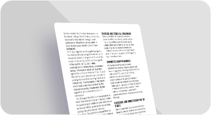 he had insulted the Prophet Muhammad on TORTURE AND OTHER ILL-TREATMENT Facebook. Yahaya Sharif-Aminu, a musician, Torture and other ill-treatment remained remained in detention following a death pervasive within the criminal justice system. sentence for blasphemy handed down in The police, military and DSS continued to 2020 by the Upper Shari’a Court in Kano. subject detainees to torture, as well as other JOURNALISTS cruel, inhuman or degrading treatment. On 7 July, Nigeria’s media regulatory agency Kubiat Akpan was tortured to death within the National Broadcasting Commission asked hours of his arrest by police on 29 August in broadcast stations in Nigeria not to report the Uyo, Akwa Ibom state. details of attacks by bandits and insurgents ENFORCED DISAPPEARANCES in the country. On 12 July, media organizations in Nigeria staged a campaign In the course of the year, Amnesty tagged “Information Blackout” to protest International received credible reports that against the proposed National Press Council security agencies, including officials from the bill and the application of some parts of the police and DSS, carried out arbitrary existing National Broadcasting Commission detentions and kept detainees (Media) Act. The two pieces of legislation, incommunicado. At least 200 people – which were under consideration by the including former militants from the Niger National Assembly, threatened to tighten Delta region, members of IPOB, #EndSARS regulation and undermine access to protesters and security suspects – were information. believed to have been subjected to On 28 August the DSS summoned television unresolved enforced disappearance during hosts Chamberlain Usor and Kayode Okikiolu the year. for questioning in relation to comments made EXCESSIVE AND UNNECESSARY USE OF by Samuel Ortom, governor of Benue state, FORCE during a live interview on Channels Television. The authorities alleged that the Security agencies used excessive force to governor’s comments were “inciting, divisive disperse peaceful protests and assemblies. and unfair”. On 20 September, Davou Bulus Bashi was ARBITRARY ARRESTS AND DETENTIONS shot dead by security officials while peacefully protesting with other students of At least 300 protesters remained in detention Plateau state Polytechnic, Barkin Ladi LGA, a year after the #EndSARS protest against the against the postponement of their exams. Nigerian security forces. Kemisola Ogunniyi, On 13 February, police arrested around 20 an 18-year-old woman who gave birth during protesters at Lekki Toll Gate in Lagos after her eight-month detention, was granted bail activists staged a protest against the on 25 June. reopening of the toll gate following the killing Three Israeli film makers, Rudy Rochman, of protesters at the venue in October 2020. Noam Leibman and David Benaym, were EXTRAJUDICIAL EXECUTIONS arrested and detained by the DSS for 20 days without trial in inhumane conditions after Nigerian security forces killed at least 115 they were accused of having links with the people and committed numerous other banned group Indigenous People of Biafra human rights violations and crimes under (IPOB). international law in response to increasing Despite a court order granting her bail, violence and killings of their officers in south- Gloria Okolie remained in detention following eastern Nigeria. Their repressive campaign her arrest by the police on 17 June on also included mass arrests, excessive and suspicion of being the friend of a wanted unlawful force, and subjecting detainees to man. Her lawyers and family alleged that she torture and other ill-treatment. was ill-treated in detention. Amnesty International Report 2021/22 278