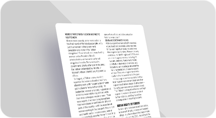 WOMEN’S PARTICIPATION IN GOVERNMENT AND THE even where schools and other education 5 RIGHT TO WORK facilities were open. Women were severely under-represented in SEXUAL AND GENDER-BASED VIOLENCE the final round of the failed peace talks, with Violence against women and girls remained just four women in the government widespread but chronically under-reported. delegation and none in the Taliban In the vast majority of cases, no action was delegation.3 Four cabinet posts were held by taken against perpetrators. Between January women under President Ghani’s and June, the MoWA registered 1,518 cases administration; women were excluded of violence against women, including 33 altogether from the Taliban’s interim murders. Beatings, harassment, forced government. Shortly after coming to power, prostitution, deprivation of alimony, and the Taliban disbanded the Ministry of forced and early marriages remained the Women’s Affairs (MoWA) and its provincial main manifestations of violence against offices. women. There was no government data In August, a Taliban spokesman told available for the second half of the year. reporters that women should refrain from Violence against women escalated further attending work until “proper systems” were from August when women’s legal and other put in place to “ensure their safety”. In support mechanisms began shutting down – September, women employed in government in particular when women’s shelters closed. ministries were told to stay at home while The Taliban’s ending of institutional and legal their male colleagues resumed work. There support for women left women at risk of were reports of women being barred from further violence, and they feared the their workplaces or sent home in different consequences of reporting incidents. parts of the country – with the exception of HUMAN RIGHTS DEFENDERS women working in the passport office, airport and health sector. In some cases, women Human rights defenders faced intimidation, were reportedly escorted home from work by harassment, threats, violence and targeted Taliban fighters and told that they would be killings. A spike in attacks that began in late 4 replaced by their male relatives. 2020 continued into 2021. According to the Women lawyers, judges and prosecutors Afghan Human Rights Defenders Committee, were effectively dismissed from their jobs and at least 17 human rights defenders were forced into hiding. They faced reprisals from killed between September 2020 and May men whom they had convicted and 2021, while hundreds more received threats. imprisoned for domestic and other gender- From late August, the Taliban occupied all based violence, who were subsequently freed 14 offices of the Afghanistan Independent from prison by the Taliban. There were Human Rights Commission, forcing its staff reports of ex-prisoners and Taliban fighters to flee the country or go into hiding. Door-to- ransacking the homes of female judges. door searches by Taliban fighters looking for RIGHT TO EDUCATION human rights defenders and journalists were On taking power, Taliban leaders announced reported, and NGO workers and their families that a “safe learning environment” was were beaten. required before women and girls could return to education. Boys were permitted to resume LGBTI PEOPLE’S RIGHTS school in mid-September, but the situation On 29 October, the Taliban spokesperson for for girls remained unclear. At the end of the the Ministry of Finance said that LGBTI rights year, except in Kunduz, Balkh and Sar-e Pul would not be recognized under sharia law. provinces, the majority of secondary schools Afghanistan’s Penal Code continued to remained closed to girls. Intimidation and criminalize consensual same-sex sexual harassment of teachers and pupils led to low relations. attendance rates, particularly among girls, Amnesty International Report 2021/22 66