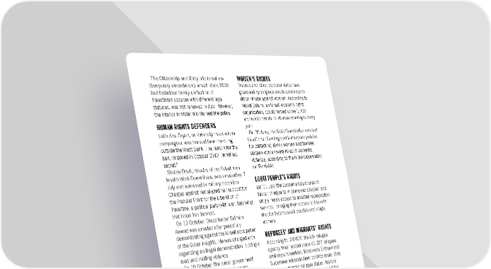 The Citizenship and Entry into Israel law WOMEN’S RIGHTS (temporary amendment), which since 2003 Divorce and other personal status laws had forbidden family unification of governed by religious courts continued to Palestinian spouses with different legal discriminate against women. According to statuses, was not renewed in July. However, Mavoi Satum, an Israeli women’s rights the interior minister maintained the policy. organization, courts forced some 1,700 HUMAN RIGHTS DEFENDERS women to remain in abusive marriages every year. Laith Abu Zeyad, an Amnesty International On 30 June, the State Comptroller reported campaigner, was banned from travelling insufficient funding and inadequate policies outside the West Bank. The reason for the for protecting at-risk women and families. ban, imposed in October 2019, remained Sixteen women were killed in domestic 5 secret. violence, according to the Israel Observatory Shatha Odeh, director of the Palestinian on Femicide. Health Work Committees, was arrested on 7 July and remained in military detention. LGBTI PEOPLE’S RIGHTS Charges against her alleged her support for On 11 July, the Supreme Court ruled in the Popular Front for the Liberation of favour of equality in same-sex couples’ and Palestine, a political party with a military wing single men’s access to assisted reproduction that Israel has banned. services, bringing their access in line with On 13 October, Druze leader Salman that for heterosexual couples and single Awwad was arrested after peacefully women. demonstrating against the Israeli occupation of the Golan Heights. He was charged with REFUGEES’ AND MIGRANTS’ RIGHTS organizing an illegal demonstration, closing a According to UNHCR, the UN refugee road and inciting violence. agency, Irael hosted some 41,327 refugees On 19 October, the Israeli government and asylum seekers. Most were Eritrean and declared six Palestinian civil society Sudanese nationals from conflict areas. Only organizations in the OPT “terrorist 1% were granted refugee status. Asylum organizations”.6 Two days earlier, the human seekers had no access to prompt and fair rights NGO Front Line Defenders had found status determination procedures, nor means that the mobile phones of six human rights of economic support. defenders from these organizations had been 7 RIGHT TO HEALTH hacked using Pegasus spyware. On 18 October, the Israeli minister of interior notified Israel purchased some 30 million doses of French-Palestinian lawyer Salah Hammouri, Covid-19 vaccines and vaccinated 64% of one of the six, of the revocation of his citizens of Israel, residents of East Jerusalem, Jerusalem residency and deportation on the migrant workers and Palestinian prisoners basis of alleged “breach of allegiance to the with two doses by October; administered State of Israel”. third doses to more than 4 million citizens; and started vaccinating five-year-olds in CONSCIENTIOUS OBJECTORS’ RIGHTS November, according to Israel’s health Conscientious objectors to military service ministry. Israel transferred 5,000 doses to the were imprisoned. Among them were Palestinian Authority in March and April, teenagers Shahar Perets and Eran while it had sent thousands of doses to Aviv, who served 88 and 114 days diplomatic allies Guatemala, Honduras and respectively in military prison for refusing to the Czech Republic in February, according to serve in the Israeli army. press reports. Amnesty International Report 2021/22 210