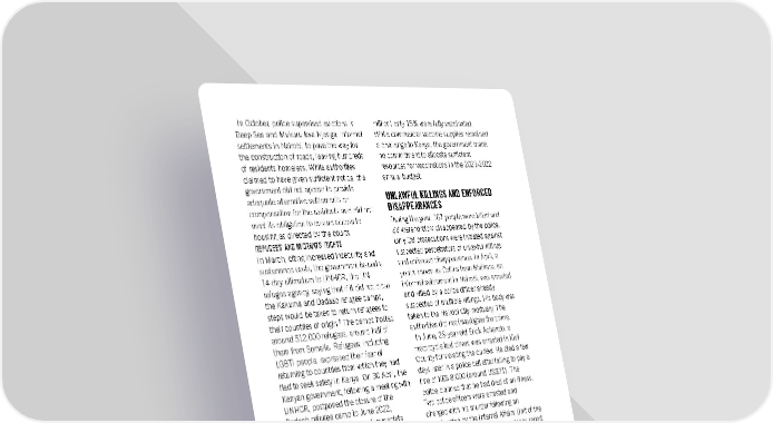 In October, police supervised evictions in million) only 15% were fully vaccinated. Deep Sea and Mukuru kwa Njenga, informal While commercial vaccine supplies remained settlements in Nairobi, to pave the way for a challenge to Kenya, the government made the construction of roads, leaving hundreds no commitment to allocate sufficient of residents homeless. While authorities resources for vaccinations in the 2021-2022 claimed to have given sufficient notice, the annual budget. government did not appear to provide UNLAWFUL KILLINGS AND ENFORCED adequate alternative settlements or DISAPPEARANCES compensation for the residents and did not meet its obligation to ensure access to During the year, 167 people were killed and housing as directed by the courts. 33 were forcibly disappeared by the police. REFUGEES’ AND MIGRANTS’ RIGHTS Only 28 prosecutions were initiated against In March, citing increased insecurity and suspected perpetrators of unlawful killings sustenance costs, the government issued a and enforced disappearance. In April, a 14-day ultimatum to UNHCR, the UN youth known as Collins from Mathare, an refugee agency, saying that if it did not close informal settlement in Nairobi, was arrested the Kakuma and Dadaab refugee camps, and killed by a police officer already steps would be taken to return refugees to suspected of multiple killings. His body was their countries of origin.5 The camps hosted taken to the Nairobi City mortuary. The around 512,000 refugees, around half of authorities did not investigate the crime. them from Somalia. Refugees, including In June, 28-year-old Erick Achando, a LGBTI people, expressed their fear of motorcycle taxi driver, was arrested in Kisii returning to countries from which they had County for violating the curfew. He died a few fled to seek safety in Kenya. On 30 April, the days later in a police cell after failing to pay a Kenyan government, following a meeting with fine of KES 8,000 (around US$71). The UNHCR, postponed the closure of the police claimed that he had died of an illness. Dadaab refugee camp to June 2022, Two police officers were arrested and retracting its initial position of immediate charged with his murder following an closure.6 investigation by the Internal Affairs Unit of the There were around 1,000 LGBTI refugees in National Police Service and an autopsy report the Kakuma and Dadaab camps who were that confirmed he died of severe head inadequately protected from homophobic injuries after being hit by a blunt object. attacks. In late March, unidentified people Following an inquest,8 Police Constable attacked the LGBTI refugee shelter in David Kibet Rono was arrested and charged Kakuma camp, throwing a petrol bomb at the in July with the murder in 2015 of 20-year- LGBTI refugees’ houses. Two LGBTI refugees old Nura Malicha Molu who died after being suffered second degree burns on about 50% shot in Nairobi’s Huruma estate. His alleged of their bodies and were evacuated for killer claimed to have acted in self-defence specialized medical attention in Nairobi. One but the inquest found that he had not posed of them, 22-year-old Chriton Atuhwera died any danger to the officer. The decision came on 12 April. Chriton Atuhwera, also known as five years after the IPOA began investigating Trinidad, had fled to Kenya from Uganda the killing and found inconsistencies, where he had been persecuted because of including in the various testimonies from 7 his sexuality. police officers. For example, material RIGHT TO HEALTH evidence, including a weapon said to belong to Nura Malicha Molu, was not presented by Although the cost of vaccinating the adult officers for analysis. population against Covid-19 was equivalent In August, the bodies of brothers Benson to 1% of the country’s annual budget Njiru Ndwiga and Emmanuel Mutura, aged (KES 38,329,600,000, around US$350 22 and 19 respectively, were found in Embu Amnesty International Report 2021/22 222