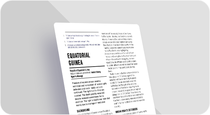 members of the security forces at her home 1. “El Salvador: Nayib Bukele’s recipe for limiting the exercise of human in the capital, Malabo, and held in a cell with rights”, 19 July dozens of men at the Judicial Police station. 2. “El Salvador: Human rights in danger”, 2 May A regular user of social media to denounce 3. El Salvador: Law initiative endangers NGOs, HRDs and media (Index: the situation of women in the country, in the AMR 29/5041/2021), 24 November months before her arrest Noelia Asama also made Facebook posts highlighting EQUATORIAL insalubrious conditions at the central food market and corruption in the main trade port. When released the following day, she was GUINEA questioned by officials about posting videos to social networks as well as about her social Republic of Equatorial Guinea media calls for President Obiang to step Head of state and government: Teodoro Obiang down. Nguema Mbasogo Noelia Asama called for a demonstration to take place on 16 October against the Freedom of expression was severely extension of the curfew to fight against restricted and harassment of human rights Covid-19. The demonstration was not defenders and social media activists authorized by the authorities and she continued. The right to a fair trial was received an official letter requiring her to violated. The death penalty remained present herself at the government regional despite renewed commitment for its delegation on 19 October. From there she abolition. The right to health was restricted, was taken to a police station and detained for mainly due to shortage of medicines. five hours before being released and told to BACKGROUND wait for further notifications and not leave the country. After more than 40 years under President HUMAN RIGHTS DEFENDERS Obiang Nguema Mbasogo and several years of economic recession, Equatorial Guinea’s Harassment and intimidation of human rights foreign relations were marred by corruption defenders and activists continued. cases. On 22 July, the country closed its On 26 May, at a meeting in Malabo with embassy in London after the UK applied opposition members, President Obiang sanctions against Teodoro Nguema Obiang accused Tutu Alicante, Executive Director of Mangue, vice-president and son of the EG Justice and member of the president, over corruption allegations. On 28 Equatoguinean Commission of Jurists, of July, the French Court of Cassation upheld receiving funds from US oil companies to his conviction on charges of embezzlement of destabilize the country. public funds. ARBITRARY DETENTIONS Throughout 2021, restrictive measures to address Covid-19 were reviewed and applied On 14 September a Health Ministry differently in the regions according to representative ordered six health workers at infection rates. the Campo Yaunde Health Centre in Malabo FREEDOM OF EXPRESSION to attend a police station to answer questions regarding a complaint about Covid-19 In its 2021 report, Reporters Without Borders vaccines being sold at the health centre to ranked Equatorial Guinea at 164 among 180 vaccinate foreigners. They were detained for countries in its press freedom index, citing a week without access to a lawyer before a strict censorship of media and journalists. judge released them for lack of formal On 29 July, social activist Noelia Asama was charges and no convincing proof of the arrested without warrant by six plain-clothed accusation. The daughter of one of the health Amnesty International Report 2021/22 159