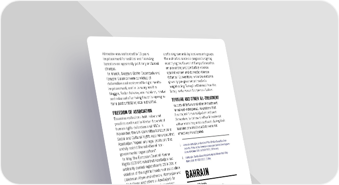 Ahmedov was sentenced to 13 years’ continuing demands by local women’s groups imprisonment for sedition and financing the authorities made no progress in signing terrorism on apparently politically motivated or ratifying the Council of Europe Convention charges. on preventing and combating violence In March, bloggers Elchin Gasanzade and against women and domestic violence Ibragim Salamov were convicted of (Istanbul Convention), while the welcome defamation and sentenced to eight months’ given by pro-government media to imprisonment; and in January another neighbouring Turkey’s withdrawal from the blogger, Sadar Askerov, was detained, beaten treaty undermined the process further. and released after being forced to apologize TORTURE AND OTHER ILL-TREATMENT for a post criticizing local authorities. FREEDOM OF ASSOCIATION Reports of torture and other ill-treatment remained widespread. Allegations that Excessive restrictions both in law and Azerbaijani forces subjected captured practice continued to hinder the work of Armenians to torture or other ill-treatment human rights defenders and NGOs. In either when they were captured, during their November, the UN Committee for Economic, transfer or while in custody were not Social and Cultural Rights recommended that effectively investigated. Azerbaijan “repeal any legal provisions that unduly restrict the activities of non- 1. Armenia-Azerbaijan: In the Line of Fire: Civilian Casualties from governmental organizations”. Unlawful Strikes in the Armenian-Azerbaijani Conflict Over Nagorno- In May, the European Court of Human Karabakh (Index: EUR 55/3502/2021), 14 January Rights (ECtHR) ruled that Azerbaijan had 2. Azerbaijan: Gender-Based Reprisals Against Women Must Stop arbitrarily denied registration to 25 NGOs in (Index: EUR 55/4103/2021), 12 May violation of the right to freedom of association (Mehman Aliyev and others v. Azerbaijan and Abdullayev and others v. Azerbaijan). In BAHRAIN October, another ECtHR ruling against Azerbaijan found that the authorities had Kingdom of Bahrain frozen bank accounts and imposed travel Head of state: Hamad bin Isa Al Khalifa bans to paralyse an NGO’s human rights Head of government: Salman bin Hamad Al Khalifa work (Democracy and Human Rights Resource Centre and Mustafayev v. The government continued to commit Azerbaijan). serious human rights violations, including GENDER-BASED VIOLENCE torture and other ill-treatment as well as suppression of freedom of expression and Women’s rights activists, women journalists assembly. Official investigations of ill- and women associated with the political treatment resulted in impunity for opposition were blackmailed and subjected perpetrators. Migrant workers faced wage to degrading gender-specific smear theft and, along with prisoners, violations of campaigns after their social media accounts their right to health. The government were hacked and private information violated the right to privacy through invasive including photos and videos were published surveillance. online.2 In November, the CESCR raised concerns BACKGROUND about the high incidence of gender-based In January, Bahrain was party to a Gulf violence against women and the very low rate Cooperation Council summit that nominally of reporting, particularly of domestic violence, ended its diplomatic dispute and severance and the limited availability of shelters and of economic links with Qatar, which began in support services for survivors. Despite 2017. However, Bahrain had not restored full Amnesty International Report 2021/22 83