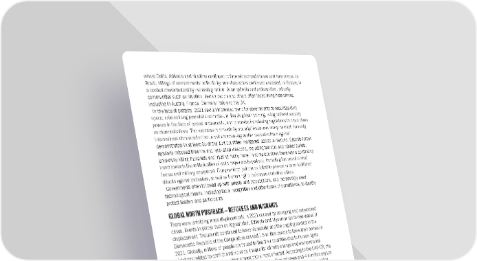 where Dalits, Adivasis and Muslims continued to face widespread abuses and hate crimes. In Brazil, killings of environmental activists by non-state actors continued unabated. In Europe, in a context characterized by increasing racism, islamophobia and antisemitism, minority communities such as Muslims, Jewish people and others often faced rising hate crimes, including in Austria, France, Germany, Italy and the UK. In the face of protests, 2021 saw an increased trend for governments to securitize civic space, criminalizing peaceful assemblies, militarizing their policing, using national security powers in the face of protest movements, and otherwise introducing regulations to crack down on demonstrations. The response to protests by security forces was heavy-handed: Amnesty International documented the use of unnecessary and/or excessive force against demonstrators in at least 85 of the 154 countries monitored, across all regions. Security forces regularly misused firearms and less-lethal weapons, including tear gas and rubber bullets, unlawfully killing hundreds and injuring many more. In some countries there was a continuing trend towards the militarization of state responses to protests, including the use of armed forces and military equipment. Compromised judiciaries failed to prevent or even facilitated attacks against protesters, as well as human rights defenders and other critics. Governments often followed up with arrests and prosecutions, and increasingly used technological means, including facial recognition and other forms of surveillance, to identify protest leaders and participants. GLOBAL NORTH PUSHBACK – REFUGEES AND MIGRANTS There were unfolding mass displacements in 2021 caused by emerging and entrenched crises. Events in places such as Afghanistan, Ethiopia and Myanmar led to new waves of displacement. Thousands continued to leave Venezuela and the ongoing conflict in the Democratic Republic of the Congo alone caused 1.5 million people to leave their homes in 2021. Globally, millions of people continued to flee their countries due to human rights violations related to conflict and violence, inequality, climate change and environmental degradation, with ethnic minorities among those most affected. According to the UNHCR, the UN Refugee Agency, as of mid-2021 there were 26.6 million refugees and 4.4 million asylum seekers worldwide. Most remained in camps for years, for example in Bangladesh, Jordan, Kenya, Turkey and Uganda, many living in constant fear of being returned back to countries they fled seeking safety. At a grassroots level, solidarity grew for people on the move, as seen in an increasing number of countries, now 15, offering some form of sponsorship scheme allowing communities to welcome refugees. Such solidarity was too often woefully lacking, however, at the national and international level. Xenophobic narratives about migration were still allowed to permeate public opinion, especially in the Global North, while domestic policies hardened further. A full dozen countries in the EU called on the bloc’s executive to dilute refugee protection rules. The international community failed to provide adequate support and, worse, restricted access to safe havens. Too often, such people on the move were also subjected to a litany of abuses – and impunity reigned for patterns of widespread violations such as pushbacks, torture and sexual violence. Many governments eschewed their responsibilities to provide protection and violated rights in their attempts to keep refugees and migrants from reaching their territory and averting spontaneous arrivals. The tactic of pushbacks became increasingly normalized, some at new flashpoints such as the Belarus/EU border. US border control officials carried out mass pushbacks of over a million refugees and migrants at the US-Mexico border using Covid-19 public health provisions as a pretext. Similarly, governments increasingly sought to externalize national asylum application procedures (even in the face of flows of refugees whom they claimed to want to support, such as from Afghanistan). Governments also continued a trend of Amnesty International Report 2021/22 17
