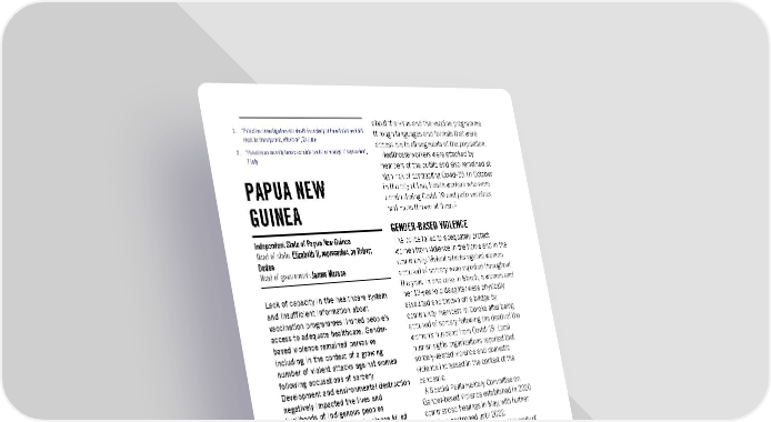 about the virus and the vaccine programme 1. “Palestine: Investigation into death in custody of Palestinian activist through languages and formats that were must be transparent, effective”, 24 June accessible to all segments of the population. 2. “Palestinian security forces escalate brutal campaign of repression”, Healthcare workers were attacked by 7 July members of the public and also remained at high risk of contracting Covid-19. In October PAPUA NEW in the city of Lae, health workers who were administering Covid-19 and polio vaccines GUINEA had rocks thrown at them.1 GENDER-BASED VIOLENCE Independent State of Papua New Guinea The police failed to adequately protect Head of state: Elizabeth II, represented by Robert women from violence in the home and in the Dadae community. Violent attacks against women Head of government: James Marape accused of sorcery were reported throughout the year. In one case in March, a woman and Lack of capacity in the healthcare system her 19-year-old daughter were physically and insufficient information about assaulted and thrown off a bridge by vaccination programmes limited people’s community members in Goroka after being access to adequate healthcare. Gender- accused of sorcery following the death of the based violence remained pervasive, woman’s husband from Covid-19. Local including in the context of a growing human rights organizations reported that number of violent attacks against women sorcery-related violence and domestic following accusations of sorcery. violence increased in the context of the Development and environmental destruction pandemic. negatively impacted the lives and A Special Parliamentary Committee on livelihoods of Indigenous peoples. Gender-based Violence established in 2020 Continued intercommunal violence killed commenced hearings in May, with further dozens of people. Incidents of arbitrary hearings postponed until 2022. arrests and police brutality occurred. In June, male students at the University of BACKGROUND Papua New Guinea disrupted a protest by female students and staff against allegations The government and Bougainville leaders of widespread sexual harassment at the reached an agreement on the timetable to university. Journalists covering the event were finalize the terms of secession of Bougainville also attacked, but no serious injuries were from Papua New Guinea following the 2019 reported. independence referendum. Under the agreement, Bougainville will assume INDIGENOUS PEOPLES’ RIGHTS independent sovereign powers by 2027. In January, Indigenous people in New Ireland RIGHT TO HEALTH province staged a sit-in protest after the government failed to pay agreed In October, following a renewed surge in compensation for the development of Covid-19 infections, hospitals in at least three Kavieng Airport on their lands. provinces reported shortages of medical In July, the Indigenous people known as supplies and healthcare workers. “shark callers”, also from New Ireland Less than 3% of the population were fully province, held a cultural festival to protest vaccinated against Covid-19 by the end of against the impacts of deep-sea mining for the year. Authorities failed to effectively minerals and metals on their livelihoods and combat widespread vaccine hesitancy, or to culture. The government declined to join the provide accurate and timely information increasing number of states, NGOs and civil Amnesty International Report 2021/22 293
