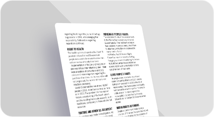 regarding the killing of the journalist Santiago INDIGENOUS PEOPLES’ RIGHTS Leguizamón in 1991, acknowledging their The state failed to return the ancestral lands responsibility. Deliberations regarding to the Tekoha Sauce community of the Avá reparations continued. Guaraní people. They had been evicted on RIGHT TO HEALTH two occasions in previous years, one of them to allow the construction of a hydroelectric 1 The health system collapsed as the Covid-19 power plant in Itaipú. pandemic intensified and thousands of In October, the UN Human Rights people were unable to access intensive care Committee issued a resolution holding units or receive adequate healthcare. Paraguay responsible for violating the human Implementation of the Covid-19 vaccination rights of the Campo Agua'e Indigenous plan was initially intermittent and slow. There community through contamination by toxic were allegations of corruption and strong agrochemicals on their lands. criticism of mismanagement regarding the LGBTI PEOPLE´S RIGHTS purchase of vaccines. As the vaccination roll- out progressed, the number of deaths and No progress was reported in the criminal infections decreased. cases concerning attacks on LGBTI people Covid-19 claimed the lives of over 14,367 during a Pride march in 2019 in the city of people in 2021, more than six times as many Hernandarias. The Hernandarias municipality as in 2020. The pandemic further exposed had banned the march in part as “contrary to historic underfunding of the health system public morals”. A lawsuit against the and the resulting inadequate access to public municipality´s decision filed by Amnesty healthcare, particularly for those with limited International in October 2019 also remained resources. stalled. TORTURE AND OTHER ILL-TREATMENT HUMAN RIGHTS DEFENDERS No progress was made in investigations into Despite a commitment made during a the alleged torture of 35 people at a naval previous UPR review, the authorities did not base in the city of Ciudad del Este in 2020. identify a mechanism for the protection of By the end of the year, more than 18 months human rights defenders and did not after the incident, no one had been charged disseminate the Declaration on Human in the case. Rights Defenders. ECONOMIC, SOCIAL AND CULTURAL CHILDREN´S RIGHTS RIGHTS The authorities did not implement sufficient By the end of the year, Paraguay had not and effective measures to prevent, identify ratified the Optional Protocol to the ICESCR and address cases of sexual exploitation and or the Regional Agreement on Access to abuse of children and adolescents. Information, Public Participation and Justice The Ministry for Childhood registered 3,850 in Environmental Matters in Latin America cases of mistreatment and sexual abuse of and the Caribbean (the Escazú Agreement). children between January and October. Of The number of forced evictions increased, these, 1,345 related to sexual abuse and several of them affecting Indigenous exploitation. The Public Prosecutor's Office communities. Many evicted groups had no received 2,284 complaints of child sexual guarantees of effective judicial remedies and abuse in the first 10 months of the year. the evictions were carried out without The authorities did not guarantee the sexual granting them any resettlement alternatives, and reproductive rights of girls. By among other irregularities. September the Ministry of Public Health and Social Welfare had registered 357 births to 2 girls aged between 10 and 14. However, in Amnesty International Report 2021/22 295