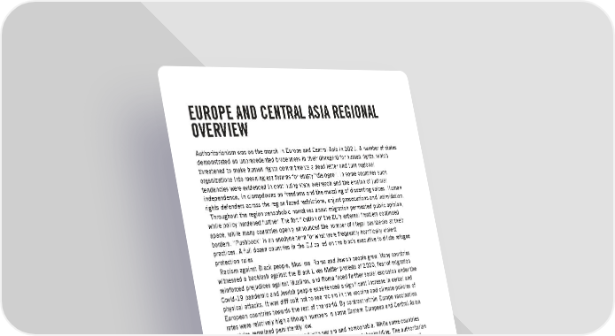 EUROPE AND CENTRAL ASIA REGIONAL OVERVIEW Authoritarianism was on the march in Europe and Central Asia in 2021. A number of states demonstrated an unprecedented brazenness in their disregard for human rights, which threatened to make human rights commitments a dead letter and turn regional organizations into meaningless forums for empty “dialogue”. In some countries such tendencies were evidenced in continuing state overreach and the erosion of judicial independence, in clampdowns on freedoms and the muzzling of dissenting voices. Human rights defenders across the region faced restrictions, unjust prosecutions and intimidation. Throughout the region xenophobic narratives about migration permeated public opinion, while policy hardened further. The fortification of the EU’s external frontiers continued apace, while many countries openly announced the number of illegal pushbacks at their borders. “Pushback” is an anodyne term for what were frequently horrifically violent practices. A full dozen countries in the EU called on the bloc’s executive to dilute refugee protection rules. Racism against Black people, Muslims, Roma and Jewish people grew. Many countries witnessed a backlash against the Black Lives Matter protests of 2020, fear of migration reinforced prejudices against Muslims, and Roma faced further social exclusion under the Covid-19 pandemic and Jewish people experienced a significant increase in verbal and physical attacks. It was difficult not to see racism in the vaccine and climate policies of European countries towards the rest of the world. By contrast within Europe vaccination rates were relatively high although numbers in some Eastern European and Central Asian countries remained persistently low. Racism often went hand in hand with sexism and homophobia. While some countries marked progress in women’s rights, several continued their backsliding. The authoritarian turn was also marked by legislative initiatives stigmatizing and restricting the rights of LGBTI people. Authoritarian backsliding, combined with the impact of Covid-19 and the Taliban takeover in Afghanistan, may have set women’s and LGBTI rights back decades in some countries. The internal backsliding was accompanied by more aggressive international relations. The aftermath of the conflict between Armenia and Azerbaijan continued to exact a deadly toll. At year’s end Russia had amassed troops on the border with Ukraine; war on the European continent seemed increasingly possible. STATE OVERREACH State overreach and disregard for traditional checks and balances were part of the authoritarian trend. In Russia the country’s main opposition politician, Aleksei Navalny, received a lengthy prison sentence on politically motivated charges and Russia ignored orders by the European Court of Human Rights (ECtHR) to free him. In Belarus the government used a fake bomb threat to divert a civilian aircraft so it could arrest exiled journalist Raman Pratasevich who was on board. A number of governments continued to overstep the limits of legitimate action under the smokescreen of Covid-19, migration “crises”, and combating terrorism/extremism. Thus, Amnesty International Report 2021/22 44