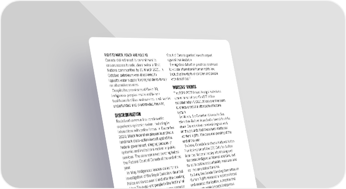 RIGHT TO WATER, HEALTH AND HOUSING Court of Canada granted leave to appeal Canada did not meet its commitment to against that decision. ensure access to safe, clean water in First Immigration detention practices continued Nations communities by 31 March 2021. In to violate international human rights law, October, petroleum was discovered in including the rights of children and people Iqaluit’s water supply, forcing residents to rely with disabilities.2 on alternative sources. Despite the prevalence of Covid-19, WOMENS’ RIGHTS Indigenous peoples continued to lack The 2021-2022 federal budget included a healthcare facilities and services, and lived in commitment of over Can$27 billion underfunded and overcrowded housing. (approximately US$21 billion) over five years DISCRIMINATION to create a national affordable childcare system. Racialized communities continued to In March, the Canadian Alliance for Sex experience systemic racism, including in Work Law Reform launched a lawsuit to strike interactions with police forces. In December down Canada’s laws criminalizing sex work 2020, Black federal employees launched a on the grounds that these laws violate sex landmark class-action lawsuit against the workers’ rights. The case was pending at the federal government, alleging decades of end of the year. systemic and institutional racism in public In June, Canada launched a National Action services. The case remained pending before Plan to implement the 231 Calls for Justice the Federal Court of Canada at the end of the from the National Inquiry into Missing and year. Murdered Indigenous Women and Girls, but In May, Indigenous leaders called for an failed to outline accountability measures and investigation of the Royal Canadian Mounted an implementation timeline. Police on Vancouver Island after the shooting In June, the Senate Standing Committee on of two Tla-o-qui-aht people in the first half of Human Rights released a report on forced 2021 which left one dead and one seriously and coerced sterilization, a practice that injured. In July, the First Nations Leadership disproportionately impacts Indigenous Council renewed the same call following the women, girls and two-spirit people. shooting of a Wet'suwet'en man in British Columbia. LGBTI PEOPLE’S RIGHTS In August, the Commission des droits de la A bill to criminalize “conversion therapy”, a personne et des droits de la jeunesse du process that seeks to change a person’s Quebec (Human Rights and Youth Rights sexual orientation or suppress a person’s Commission of Quebec) published a report gender identity or expression, became law on indicating that racial profiling complaints had 8 December. increased by 87%, from 46 in 2018-2019 to CORPORATE ACCOUNTABILITY 86 in 2020-2021. In January, Amazon factory staff reportedly REFUGEES’ AND MIGRANTS’ RIGHTS continued to work despite health and safety Between 21 March 2020 and 21 June 2021, concerns related to the pandemic. The 444 people seeking asylum were pushed company opposed workers’ attempts to back to the USA under measures to curb the unionize. Covid-19 pandemic. These measures were Canadian resource extraction companies rescinded on 20 November 2021. continued to operate extraterritorially with In April, the Federal Court of Appeal little human rights or environmental oversight overturned a decision that found the Canada- from the Canadian or host-state US Safe Third Country Agreement governments. unconstitutional. In December, the Supreme Amnesty International Report 2021/22 117