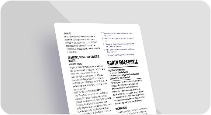 KWANLISO 3. “Drugs have become a part of everyday life in North Korea” (Korean Four Kwanliso were known to remain in only), 31 October operation although their existence was 4. “North Korea’s food shortage and the right to food”, (Korean only), 30 denied by the authorities. Up to 120,000 July detainees were believed to be held and 5. “Silent society – Suppressed freedom of political expression in North subjected to forced labour, torture and other Korea”, (Korean only), 31 December ill-treatment. 6. “Blind spots for human rights, detention facilities in North Korea”, (Korean only), 30 June ECONOMIC, SOCIAL AND CULTURAL 7. “Poor labour rights in North Korea”, (Korean only), 10 February RIGHTS WORKERS’ RIGHTS NORTH MACEDONIA Wages in state-run factories remained very low. Some workers in state-run factories and other enterprises, where the pay is Republic of North Macedonia significantly lower than the cost of living, Head of state: Stevo Pendarovski resorted to bribing officials in an effort to Head of government: Dimitar Kovačevski (designate) exchange their designated working hours for (replaced Zoran Zaev in December) better paid work elsewhere, including in the Former government officials were brought to grey economy.7 account. Conditions for detainees and RIGHT TO FREE CHOICE OF EMPLOYMENT prisoners failed to meet international The “Songbun” system of “ascribed status” standards. Hate speech was directed at remained in place, dictating educational, ethnic minorities and LGBTI people, as well political and professional mobility for all North as women and girls, who were not protected Koreans. Children of farmers were often from gender-based violence. Discrimination obliged to take over their parents’ jobs. Some persisted against Roma and Albanians. parents reportedly resorted to bribery or BACKGROUND powerful contacts to give their children the opportunity to change careers. The country’s efforts towards EU membership CHILD/FORCED LABOUR were blocked by Bulgaria, in a dispute over State media claimed that orphans language, culture and Macedonia’s failure to “volunteered” en masse to take jobs in recognize Bulgarian ethnicity. This – along unpopular and dangerous manual labour with the failure to implement domestic professions, including mining. reforms and poor local election results – INTERNATIONAL ENGAGEMENT contributed to Zoran Zaev’s resignation in North Korea participated in several December. international forums related to economic, ACCOUNTABILITY social and cultural rights. In July, it participated in the UN High-level Political Investigations continued into alleged serious Forum and presented a Voluntary National crimes, including human rights violations, by Review for the first time, effectively agreeing former government ministers and officials. to implement the Sustainable Development Sašo Mijalkov, former head of the secret Goals. In November, North Korea participated police, and 10 former police officers and in the COP26 UN Climate Change employees were convicted in February for Conference. offences arising from widespread unlawful wire-tapping revealed in 2015. 1. “Isolation and human rights violations in North Korea's response to In June, the former parliamentary speaker and two ministers were convicted for their infectious diseases”, (Korean only), 31 May 2. “Recent health care in North Korea”, (Korean only), 30 September role in organizing the April 2017 storming of parliament, when 100 people, including members of parliament, were injured. Amnesty International Report 2021/22 282
