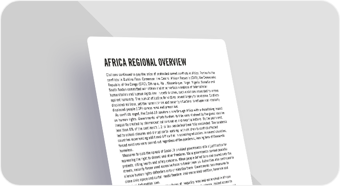 AFRICA REGIONAL OVERVIEW Civilians continued to pay the price of protracted armed conflicts in Africa. Parties to the conflicts in Burkina Faso, Cameroon, the Central African Republic (CAR), the Democratic Republic of the Congo (DRC), Ethiopia, Mali, Mozambique, Niger, Nigeria, Somalia and South Sudan committed war crimes and other serious violations of international humanitarian and human rights law. In certain cases, such violations amounted to crimes against humanity. The pursuit of justice for victims proved largely to be elusive. Conflicts displaced millions, yet the humanitarian and security situations in refugee and internally displaced people (IDP) camps remained precarious. As conflicts raged, the Covid-19 pandemic tore through Africa with a devastating impact on human rights. Governments’ efforts to stem its tide were hindered by the global vaccine inequality created by pharmaceutical companies and wealthy nations. By the year’s end, less than 8% of the continent’s 1.2 billion people had been fully vaccinated. The pandemic led to school closures and disruption to learning, with children in conflict-affected countries experiencing additional difficulties in accessing education. In several countries, forced evictions were carried out regardless of the pandemic, leaving tens of thousands homeless. Measures to curb the spread of Covid-19 provided governments with a justification for repressing the right to dissent and other freedoms. Many governments banned peaceful protests, citing health and safety concerns. When people defied bans and poured onto the streets, security forces used excessive force to break them up. Authorities also continued to silence human rights defenders or to criminalize them. Governments took measures to close civic space and curtail media freedom, and weaponized sedition, terrorism and criminal defamation laws. Gender discrimination and other forms of inequality remained entrenched in African countries. Major concerns included spikes in gender-based violence, limited access to sexual and reproductive health services and information, early and forced marriages, and the exclusion of pregnant girls from schools. Meanwhile, LGBTI people faced harassment, arrest and prosecution for their real or perceived sexual orientation or gender identity. Several countries were particularly affected by drought aggravated by climate change, while concerns relating to environmental degradation emerged in others. UNLAWFUL ATTACKS AND KILLINGS Targeted attacks on civilians and civilian infrastructure were pervasive in every conflict in the region. In Cameroon’s Far North region, Boko Haram and the Islamic State in West Africa (ISWAP) had killed at least 70 civilians in around 51 attacks by 24 October. In CAR, national forces and their allies targeted a mosque in February, killing 14 people. The UN Multidimensional Integrated Stabilization Mission in the Central African Republic (MINUSCA) said that 228 civilians were killed between June and October as a result of the conflict. In Ethiopia, the Tigray People’s Liberation Front (TPLF), national security forces, and militia groups were responsible for the massacre, in many cases based on ethnic identity, of hundreds of civilians, including in the towns of Bora, Edaga Berhe and Adi-Goshu. In Niger, the Islamic State in the Greater Sahara (ISGS) attacked villagers and traders in the Tillabéri and Tahoua regions. Three such attacks between January and March resulted in at least 298 Amnesty International Report 2021/22 19