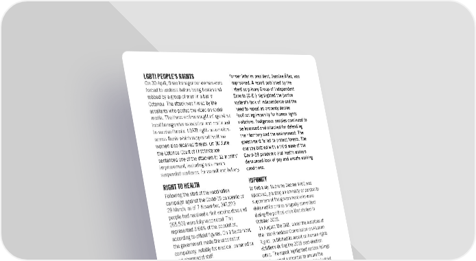 former interim president, Jeanine Áñez, was LGBTI PEOPLE’S RIGHTS On 30 April, three transgender women were imprisoned. A report published by the forced to undress before being beaten and Interdisciplinary Group of Independent robbed by a group of men in a bar in Experts (GIEI) highlighted the justice Cotonou. The attack was filmed by the system's lack of independence and the assailants who posted the video on social need to repeal an amnesty decree media. The three victims sought refuge with a facilitating impunity for human rights local transgender association and continued violations. Indigenous peoples continued to to receive threats. LGBTI rights associations be harassed and attacked for defending across Benin which supported the three their territory and the environment. The women also received threats. On 30 June, government failed to protect forests. The the Cotonou Court of First Instance country battled with a third wave of the sentenced one of the attackers to 12 months’ Covid-19 pandemic and health workers imprisonment, including a six-month denounced lack of pay and unsafe working suspended sentence, for assault and battery. conditions. RIGHT TO HEALTH IMPUNITY Following the start of the vaccination In February, Supreme Decree 4461 was campaign against the Covid-19 pandemic on approved, granting an amnesty or pardon to 29 March, as of 7 November, 347,270 supporters of the government who were people had received a first vaccine dose and detained for crimes allegedly committed 265,501 were fully vaccinated. This during the political crisis that started in represented 3.64% of the population, October 2019. according to official figures. On 1 September, In August, the GIEI, under the auspices of the government made the vaccination the Inter-American Commission on Human compulsory, notably for medical, paramedical Rights, published its report on human rights and pharmacist staff. violations during the 2019 post-election RIGHT TO TRUTH, JUSTICE AND crisis. The report highlighted serious failings REPARATION on the part of authorities to ensure the autonomy and independence of the judicial On 21 January, the Constitutional Court branch and the Attorney General's Office, as validated the withdrawal of Benin’s well as obstacles to truth, justice and declaration made under Article 34(6) of the reparation for the victims of grave human Protocol to the African Charter on Human rights violations during the post-election and Peoples’ Rights on the Establishment of crisis. an African Court on Human and Peoples’ Following the release of the GIEI report, Rights, thus preventing NGOs and individuals authorities promised to repeal the amnesty from having direct access to the Court. decree but continued to use the justice system to target political opponents, ignoring BOLIVIA fair trial guarantees. RIGHT TO A FAIR TRIAL Plurinational State of Bolivia From January to June, authorities and Head of state and government: Luis Alberto Arce members of the ruling political party charged Catacora at least 41 officials of the former interim government, human rights defenders, Dozens of former government officials, lawyers and judges, with vaguely defined lawyers, judges and human rights defenders offences including “terrorism”, “sedition” and were accused of staging a coup in 2019 “conspiracy”. This was part of a wider and charged with vague offences and the Amnesty International Report 2021/22 95