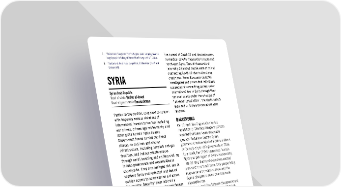 7. “Switzerland: Dangerous “Yes” vote gives police sweeping powers to the spread of Covid-19 and blocked access target people including children without charge or trial”, 13 June to medical care for thousands in south and 8. “Switzerland: No to facial recognition”, 18 November (French and north-east Syria. Tens of thousands of German only) internally displaced people were at risk of contracting Covid-19 due to dire living SYRIA conditions. Some European countries investigated and prosecuted individuals suspected of committing crimes under Syrian Arab Republic international law in Syria through their Head of state: Bashar al-Assad national courts under the principle of Head of government: Hussein Arnous “universal jurisdiction”. The death penalty remained in force and executions were Parties to the conflict continued to commit reported. with impunity serious violations of BACKGROUND international humanitarian law, including war crimes, crimes against humanity and On 12 April, the Organisation for the other gross human rights abuses. Prohibition of Chemical Weapons (OPCW) Government forces carried out direct reported that there “were reasonable attacks on civilians and civilian grounds” to believe that the Syrian infrastructure, including hospitals and gas government had conducted a chlorine attack facilities, and indiscriminate attacks on Saraqib city in Idlib governorate in 2018. through aerial bombing and artillery shelling As a result, the OPCW suspended “certain in Idlib governorate and western Aleppo rights and privileges” of Syria’s membership. countryside. They also besieged civilians in On 26 May, Bashar al-Assad was elected southern Syria and restricted and denied president for a fourth term. Only people living civilian access to humanitarian aid across in government-controlled areas and the the country. Security forces arbitrarily Syrian diaspora in some countries were subjected refugees returning to their homes allowed to vote. to unlawful detention, torture and other ill- In June, hostilities between the government, treatment, and enforced disappearance. supported by Russia, and Hay’at Tahrir al- Government authorities continued to Sham escalated in Idlib governorate and arbitrarily detain tens of thousands of Aleppo countryside as government forces people, including peaceful activists, tried to regain full control of the M4 and M5 humanitarian workers, lawyers and highways. In July, the government launched journalists, subjecting many to enforced a military offensive against armed opposition disappearance. The Syrian National Army groups in Daraa al-Balad city, which ended (SNA), supported by Turkey, continued to with a ceasefire agreement around mid- subject civilians in the northern cities of September. Afrin and Ras al-Ayn to arbitrary detention, Between July and August, unidentified torture and other ill-treatment, and armed groups detonated improvised abduction. In the north-east, the explosive devices in Afrin and Ras al-Ayn, two Autonomous Administration led by the cities under the control of pro-Turkey armed Democratic Union Party (PYD) arbitrarily groups, killing and injuring many civilians detained children in al-Hol camp and and damaging civilian infrastructure. In transferred them to prisons where they were August, unknown groups shelled al-Bab, a detained with adults. In the north-west, the city in northern Aleppo countryside controlled opposition armed group Hay’at Tahrir al- by pro-Turkey armed groups, causing civilian Sham arbitrarily detained and harassed casualties and destroying homes. activists and journalists. The government failed to provide a robust response to curb Amnesty International Report 2021/22 353