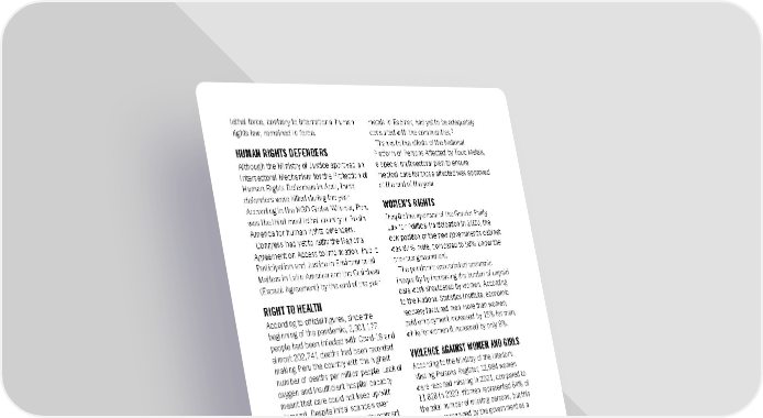 lethal force, contrary to international human metals in Espinar, had yet to be adequately 2 rights law, remained in force. consulted with the communities. HUMAN RIGHTS DEFENDERS Thanks to the efforts of the National Platform of Persons Affected by Toxic Metals, Although the Ministry of Justice approved an a special multisectoral plan to ensure Intersectoral Mechanism for the Protection of medical care for those affected was approved Human Rights Defenders in April, three at the end of the year. defenders were killed during the year. According to the NGO Global Witness, Peru WOMEN’S RIGHTS was the third most lethal country in South Despite the approval of the Gender Parity America for human rights defenders. Law for Political Participation in 2020, the Congress had yet to ratify the Regional composition of the new government’s cabinet Agreement on Access to Information, Public was 87% male, compared to 58% under the Participation and Justice in Environmental previous government. Matters in Latin America and the Caribbean The pandemic exacerbated economic (Escazú Agreement) by the end of the year. inequality by increasing the burden of unpaid RIGHT TO HEALTH care work shouldered by women. According to the National Statistics Institute, economic According to official figures, since the recovery favoured men more than women; beginning of the pandemic, 2,301,177 paid employment increased by 15% for men, people had been infected with Covid-19 and while for women it increased by only 8%. almost 202,741 deaths had been recorded, VIOLENCE AGAINST WOMEN AND GIRLS making Peru the country with the highest number of deaths per million people. Lack of According to the Ministry of the Interior’s oxygen and insufficient hospital capacity Missing Persons Register, 12,984 women meant that care could not keep up with were reported missing in 2021, compared to demand. Despite initial scandals over 11,828 in 2020. Women represented 64% of corruption and the failure by government the total number of missing persons, but this officials to respect prioritization in the was not recognized by the government as a vaccination programme, the process form of gender-based violence. continued with clear prioritization criteria and According to the Ombudsperson’s Office, in in accordance with international standards. 2021 146 women were victims of femicide, By the end of the year more than 80% of the compared to 136 in 2020. target population (those over 12 years of age) SEXUAL AND REPRODUCTIVE RIGHTS has been vaccinated. Victims of forced sterilizations more than 25 INDIGENOUS PEOPLES’ RIGHTS years earlier were still seeking truth, justice In July, the Cusco Regional Health Authority and reparation. In March, the Public shared its Action Plan with Amnesty Prosecutor's Office finally brought charges International and environmental health against former president Alberto Fujimori and specialist Fernando Serrano of Saint Louis several health ministers under his 1 University. The plan had been ordered by a administration as the “indirect perpetrators”. December 2020 court ruling to address the In December, the judiciary ordered a judicial health crisis caused by toxic substances investigation against them. However, the among Indigenous communities in the executive had yet to grant reparations to the mining area of Espinar. By the end of 2021, victims, despite the fact that the official the plan, which is not based on specific registry of victims of forced sterilizations analysis of the risks to human health and the contained more than 7,000 registered cases. environment related to exposure to toxic During the pandemic, the number of births to girls under 10 years of age was Amnesty International Report 2021/22 297