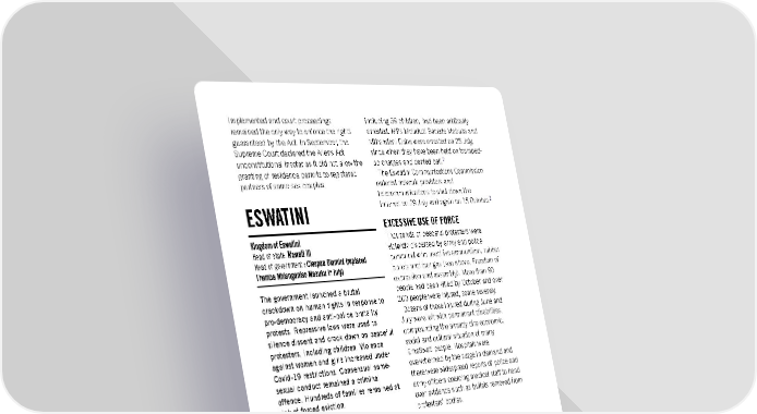 implemented and court proceedings including 38 children, had been arbitrarily remained the only way to enforce the rights arrested. MPs Mduduzi Bacede Mabuza and guaranteed by the Act. In September, the Mthandeni Dube were arrested on 25 July, Supreme Court declared the Aliens Act since when they have been held on trumped- unconstitutional insofar as it did not allow the up charges and denied bail.2 granting of residence permits to registered The Eswatini Communications Commission partners of same-sex couples. ordered network providers and telecommunications to shut down the ESWATINI internet on 29 July and again on 15 October.3 EXCESSIVE USE OF FORCE Kingdom of Eswatini Thousands of peaceful protesters were Head of state: Mswati III violently dispersed by army and police Head of government : Cleopas Dlamini (replaced personnel who used live ammunition, rubber Themba Nhlanganiso Masuku in July) bullets and tear gas (see above, Freedom of expression and assembly). More than 80 The government launched a brutal people had been killed by October and over crackdown on human rights in response to 200 people were injured, some severely. pro-democracy and anti-police brutality Dozens of those injured during June and protests. Repressive laws were used to July were left with permanent disabilities, silence dissent and crack down on peaceful compounding the already dire economic, protesters, including children. Violence social and cultural situation of many against women and girls increased under EmaSwati people. Hospitals were Covid-19 restrictions. Consensual same- overwhelmed by the surge in demand and sexual conduct remained a criminal there were widespread reports of police and offence. Hundreds of families remained at army officers coercing medical staff to hand risk of forced eviction. over evidence such as bullets removed from FREEDOM OF EXPRESSION AND protesters’ bodies. ASSEMBLY DISCRIMINATION In May, the government launched a brutal GENDER-BASED VIOLENCE crackdown on human rights in response to Incidents of gender-based violence persisted ongoing protests demanding an end to police and one in three women had experienced brutality and calling for democratic reform. such abuse by the age of 18; 48% of women The protests were sparked by the suspicious reported having experienced some form of death of 25-year-old law student Thabani sexual violence. The 2018 Sexual Offences Nkomonye, allegedly at the hands of Royal and Domestic Violence Act was not enough Eswatini Police Service officers. They were on its own to combat violence against women led by young activists, human rights and girls, especially when economic defenders, and civil society and political conditions and social and cultural norms groups who demanded an end to years of posed a continual barrier to justice and political repression.1 largely enabled perpetrators to act with The authorities used repressive laws, impunity. Covid-19 lockdown measures including the 1938 Sedition and Subversive hindered survivors’ access to support Activities Act and the 2008 Suppression of services and justice mechanisms and Terrorism Act, to silence critics. Journalists, increased the risk of violence. human rights defenders and political activists Girls were particularly affected due to school were prosecuted and jailed; they lived in fear closures resulting in rising numbers of of reprisals for speaking out against teenage pregnancies. repression. By October, over 1,000 people, Amnesty International Report 2021/22 162
