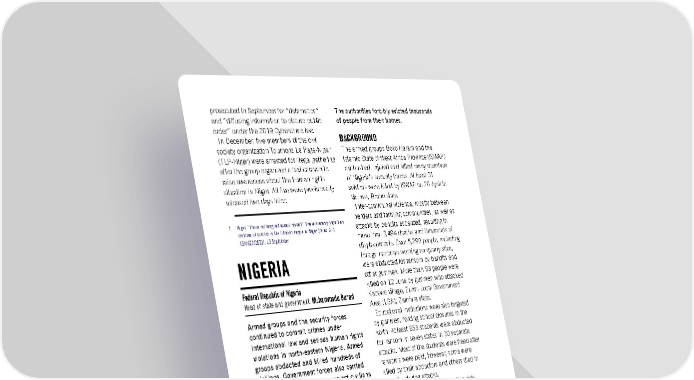 prosecuted in September for “defamation” The authorities forcibly evicted thousands and “diffusing information to disturb public of people from their homes. order” under the 2019 Cybercrime law. BACKGROUND In December, five members of the civil society organization Tournons La Page-Niger The armed groups Boko Haram and the (TLP-Niger) were arrested for illegal gathering Islamic State of West Africa Province (ISWAP) after the group organized a taxi caravan to ambushed, injured and killed many members raise awareness about the human rights of Nigeria’s security forces. At least 31 situation in Niger. All five were provisionally soldiers were killed by ISWAP on 26 April in released two days later. Mainok, Borno state. Inter-communal violence, mostly between 1. Niger: “I have nothing left except myself”: The worsening impact on herders and farming communities, as well as children of conflict in the Tillabéri region of Niger (Index: AFR attacks by bandits escalated, resulting in 43/4627/2021), 13 September more than 3,494 deaths and thousands of displacements. Over 5,290 people, including foreign nationals working on quarry sites, NIGERIA were abducted for ransom by bandits and other gunmen. More than 93 people were Federal Republic of Nigeria killed on 12 June by gunmen who attacked Head of state and government: Muhammadu Buhari Kadawa village, Zurmi Local Government Area (LGA), Zamfara state. Armed groups and the security forces Educational institutions were also targeted continued to commit crimes under by gunmen, forcing school closures in the international law and serious human rights north. At least 855 students were abducted violations in north-eastern Nigeria. Armed for ransom in seven states in 10 separate groups abducted and killed hundreds of attacks. Most of the students were freed after civilians. Government forces also carried ransoms were paid; however, some were out indiscriminate attacks against civilians killed by their abductors and others died in during counter-insurgency efforts. crossfire during attacks. Throughout the year, the Borno state Throughout the year, some nationwide governor carried out forced resettlements of Covid-19 restrictions remained in place. internally displaced people (IDPs) and VIOLATIONS OF INTERNATIONAL closures of IDP camps. More than 3,494 HUMANITARIAN LAW people died in inter-communal violence and bandit attacks, and more than 5,290 ABUSES BY ARMED GROUPS people were abducted for ransom by Armed groups, including Boko Haram and bandits and other gunmen. The rights to ISWAP, continued to commit war crimes and freedom of expression and peaceful crimes against humanity in North East assembly and association were routinely Nigeria, killing and abducting civilians, violated. Journalists and activists were looting property, and committing rape and arrested or questioned for exercising their other sexual violence against women and right to freedom of expression. Law girls. They carried out at least 30 attacks, enforcement agents used excessive force to causing more than 123 civilian deaths. disperse protests, sometimes leading to On 3 January, at least 50 people including deaths. Hundreds of people who an aid worker were abducted while travelling demonstrated against the security forces in along the Maiduguri-Damaturu way. On 23 2020 remained in detention. The right to February, at least 16 people were killed and health was undermined by the authorities 47 injured when Boko Haram fired rocket- and health workers resorted to strike action. propelled grenades on parts of Maiduguri, Borno state. Amnesty International Report 2021/22 276