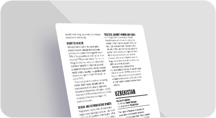 people’s well-being, especially those living in VIOLENCE AGAINST WOMEN AND GIRLS situations of vulnerability. According to the Observatory on Gender- RIGHT TO HEALTH Based Violence and Access to Justice, the number of femicides increased in 2021; 30 Although the roll-out of the vaccination femicides were recorded. Changes by the programme was delayed due to the late Ministry of the Interior in the way reports of purchase of supplies, it managed to reach gender-based violence are registered had a 78% of the population with at least with one direct impact on statistics, as repeated dose and 75% with two doses. This led to a offences by the same individuals were no lifting of restrictions and a reduction in the longer recorded as separate incidents, but number of patients in intensive care and rather as a single complaint. coupled with the country’s robust universal There were also obstacles to the health system, resulted in a positive health implementation of the law on gender-based situation as regards Covid-19 towards the violence (Law No. 19.580) because of the end of 2021. failure to allocate the resources needed to Public policy failed to address increasing establish multipurpose courts able to deal mental health needs, despite calls for with all matters related to gender-based improvements in this area by specialists. violence. According to the Ministry of Health, in 2021 there was a 20% increase in the suicide rate compared to the mean average of the UZBEKISTAN previous five years. SEXUAL AND REPRODUCTIVE RIGHTS Republic of Uzbekistan Head of state: Shavkat Mirziyoyev Pregnancies in girls under 15 remained a Head of government: Abdulla Aripov largely unacknowledged problem, despite 60 births and 47 abortions involving girls in that The rights to freedom of expression, age group in 2020, the latest year for which association and peaceful assembly statistics were available. remained tightly restricted. Major progress Although there was a protocol in place for was reported in the eradication of forced the care of children under 15 who are labour in the cotton sector. Some pregnant and a notification system for health safeguards against torture and other ill- teams dealing with such cases, public policy treatment were introduced, although reports in this area remained inadequate. In addition, of such abuse continued. Over 2,000 comprehensive sexuality education was not people remained imprisoned for their implemented in a comprehensive and peaceful religious beliefs. Violence against consistent manner. women remained widespread. Consensual The abortion law in Uruguay, which was sexual relations between men remained a changed in 2012, allows first trimester criminal offence. abortion on request. However, difficulties in BACKGROUND accessing abortion persisted in rural areas, where health centres were less accessible, Ongoing reforms slowed or were rolled back. and medical professionals refused to perform Political and civil activists complained of abortions on grounds of conscience. In harassment, surveillance and threats ahead addition, political figures made speeches of the presidential election, from which seeking to discourage abortion among people independent candidates were effectively living in poverty; such discriminatory barred. A new draft criminal code was statements could signal a major setback for published in February but not adopted before sexual and reproductive rights in the country. the end of the year. Amnesty International Report 2021/22 396