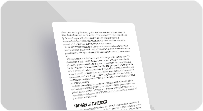 of vaccines meant only 6% of the population had been vaccinated. Yet after President Kaïs Saïed dissolved parliament and claimed exceptional powers, vaccine roll-out accelerated and by the end of the year 46% of the population had been vaccinated. In an act of institutionalized discrimination, Israel left out around 5 million Palestinians under military occupation in the West Bank and Gaza from its vaccine campaign. Tunisia and Morocco introduced mandatory vaccine passes for all those entering public or private workplaces, and for travel outside of the country. In Tunisia, the decree on the vaccine pass infringed on other rights, allowing employers to suspend unvaccinated workers without pay. With the exception of Gulf states and Israel, the second year of the pandemic exposed the shortcomings of health systems across the region, and the challenges of accessibility and affordability of adequate healthcare. In Lebanon, the government failed to ensure access to fuel for critical health facilities, including hospitals, or roll out any social protection plan in the midst of an economic collapse. In November it lifted subsidies on medicines without ensuring access to essential supplies for those unable to afford spiralling prices, including patients with severe chronic conditions. In Egypt, a national budget adopted in June failed to meet the constitutionally mandated allocation of 3% of GDP to health, and reduced spending on health insurance and medicine. The Syrian government actively contributed to ongoing shortages in the health sector in north-east Syria by restricting delivery of humanitarian aid, impacting cancer and diabetes patients. In Libya, where armed groups and militias continued to attack health care and humanitarian workers, several Covid-19 isolation facilities were closed due to damage or lack of equipment and infrastructure. FREEDOM OF EXPRESSION Authorities across the region continued to arrest, detain and prosecute individuals solely for their peaceful expression, often using subjective penal code provisions criminalizing “insult” to prosecute criticism of the authorities, including their response to the pandemic, and imprison critics. A court in the Kurdistan Region of Iraq sentenced five activists and journalists to six years’ imprisonment each for acts related to their use of social media and journalistic work, under vaguely worded laws, while the Kurdistan Regional Government (KRG) justified speech- related prosecutions as necessary for “national security reasons”. In one particularly flagrant case, in Saudi Arabia Abdulrahman al-Sadhan was sentenced to 20 years’ imprisonment and a travel ban of equal duration for his tweets that were critical of the government's economic policies. In Morocco, a court sentenced YouTuber Jamila Saadane to three months in prison for “insulting” state institutions after uploading videos accusing the authorities of covering up prostitution networks and human trafficking. In Algeria, the authorities increasingly used vaguely worded terrorism-related charges to prosecute people for their legitimate political speech or activism. Governments across the region introduced further draconian legislation criminalizing free speech. In Libya, parliament passed a cybercrime law that severely limits free expression online, allows for government surveillance and censorship, and punishes with imprisonment the dissemination of content deemed “immoral”. In Egypt, the president ratified a law criminalizing the publication of information on pandemics on vaguely worded grounds. The Iranian authorities arrested and prosecuted six people for discussing legal action against the government’s failure to secure access to Covid-19 vaccines. The Tunisian Ministry of Health barred all but a selected list of public sector health workers from speaking publicly about the Covid-19 pandemic, threatening them with disciplinary action or criminal prosecution if they do not comply. Amnesty International Report 2021/22 54