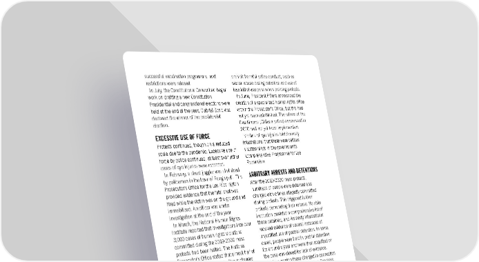 successful vaccination programme, and prohibit harmful police conduct, such as restrictions were relaxed. sexual abuse during detention and use of In July, the Constitutional Convention began less lethal weapons when policing protests. work on drafting a new Constitution. In June, President Piñera announced the Presidential and congressional elections were creation of a specialized human rights office held at the end of the year; Gabriel Boric was within the Prosecutor’s Office, but this had declared the winner of the presidential not yet been established. The reform of the election. Carabineros (Chilean police) announced in EXCESSIVE USE OF FORCE 2020 had not yet been implemented. Victims of eye injuries told Amnesty Protests continued, though on a reduced International that there were serious scale due to the pandemic. Excessive use of shortcomings in the government’s force by police continued; at least two further Comprehensive Programme for Eye cases of eye injuries were recorded. Reparation. In February, a street juggler was shot dead ARBITRARY ARRESTS AND DETENTIONS by policemen in the town of Panguipulli. The Prosecutor’s Office for the Los Ríos region After the 2019-2020 mass protests, provided evidence that the fatal shot was hundreds of people were detained and fired while the victim was on the ground and charged with crimes allegedly committed immobilized. An officer was under during protests. This triggered further investigation at the end of the year. protests demanding their release. No state In March, the National Human Rights institution provided a comprehensive list of Institute reported that investigations into over those detained, and Amnesty International 3,000 cases of human rights violations received evidence of several instances of committed during the 2019-2020 mass unjustified use of pretrial detention. In some protests had been halted. The National cases, people were held in pretrial detention Prosecutor’s Office stated that almost half of for around a year and were then acquitted or its cases had been closed without charges the case was closed for lack of evidence. being brought. In May, the National A bill to pardon those charged in connection Prosecutor instructed all prosecutors to with the mass protests was before Congress. review their cases and consider reopening them if minimum investigative standards had INDIGENOUS PEOPLES’ RIGHTS not been met. In March, the Inter-American Commission on Some investigations did make progress Human Rights began examining the during the year, including those relating to admissibility of a petition submitted by three the injuries sustained by Gustavo Gatica and Mapuche men, José Tralcal, Luis Tralcal and Fabiola Campillai1 and those into the deaths José Peralino, convicted in an unfair trial in of Manuel Rebolledo and Kevin Gómez. connection with a fire in which two people At least six lawsuits filed against President died. Piñera and other current and former In May, the Supreme Court confirmed the government officials for crimes against sentences of seven former policemen and a humanity under Chilean law were being lawyer involved in the death of Camilo investigated by the Valparaíso Regional Catrillanca, a young Mapuche man, and the Prosecutor. In April, lawsuits were filed injuries sustained by a teenage boy who was against high-ranking police officers for failing with him, and in obstructing the investigation to take action to stop the pattern of injuries to into the case. The two had been shot at by protesters. police during a pursuit of suspects in a At the end of the year, Congress was robbery case, in which they were not debating several bills to simplify access to involved. Three of the former police officers civil reparations for victims and expressly were set to serve prison terms. Amnesty International Report 2021/22 123