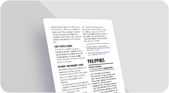 nearly three times higher than in 2019 (rising On 27 September, the trial resumed of from nine to 24), and there were 1,149 births members of the Peruvian military accused of to girls under of 14, according to the Ministry systematically raping scores of women in of Health. According to the United Nations Manta (Huancavelica province) more than 35 Population Fund, four girls under 15 years of years earlier, raising hopes that victims of age gave birth every day in Peru during the human rights violations might finally obtain year. truth, justice and reparation. LGBTI PEOPLE’S RIGHTS 1. Peru: Authorities Must Redesign and Consult on Action Plan to Draft bills were submitted by a group of Address Health Crisis Caused by Toxic Substances in Espinar (Index: members of congress on legal recognition of AMR 46/4767/2021), 23 September gender identity for transgender people and 2. Failed State of Health: Health Emergency in Indigenous Peoples of marriage equality for same-sex couples. Espinar, Peru (Index: AMR 46/3829/2021), 18 May However, these bills had not been approved by the end of the year. PHILIPPINES REFUGEES’ AND MIGRANTS’ RIGHTS Peru hosted more than half a million asylum Republic of the Philippines seekers and more than 1.2 million Head of state and government: Rodrigo Roa Duterte Venezuelan nationals in 2021, 43% of whom were in an irregular situation, preventing Lack of accountability continued to them from accessing rights such as facilitate unlawful killings and other human healthcare. rights violations under the government’s The processing of asylum applications was “war on drugs” campaign. The International suspended in February 2020 due to Covid-19 Criminal Court (ICC) announced an restrictions; the suspension remained in investigation into crimes against humanity. place until the end of 2021. Human rights defenders, political activists In January, the Peruvian government and politicians were subjected to unlawful militarized its borders to restrict the arrival of killings, arbitrary arrest and detention, and asylum seekers and migrants. This led to harassment. Indigenous peoples were the several incidents of intimidation by the target of attacks by the authorities and Peruvian military, such as shooting into the unknown assailants. Inadequate access to air to disperse groups of Venezuelans at the healthcare worsened as Covid-19 infection border. rates rose. Maria Ressa, journalist and critic Two regularization processes for migrants of the “war on drugs”, won a Nobel Peace and asylum seekers were opened, but were Prize but continued to face decades in jail marked by bureaucratic hurdles, prohibitive for pending cases brought against her costs, or arbitrarily not allowing regularization including by the government. of certain groups, such as children and BACKGROUND adolescents in family groups. In December, the regularization process was started for Restrictions remained in place in response to more than 3,000 children and adolescents. the Covid-19 pandemic that RIGHT TO TRUTH, JUSTICE AND disproportionately affected people living in REPARATION poverty. Preparations began for the May 2022 presidential elections. According to the Ombudsperson’s Office, EXTRAJUDICIAL EXECUTIONS AND only 20% of the bodies of more than 21,000 IMPUNITY people on the National Register of Forced Disappearances related to the internal armed Extrajudicial executions and other human conflict (1980-2000) had been recovered. rights violations continued under the Amnesty International Report 2021/22 298