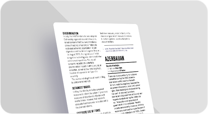 DISCRIMINATION lockdown measures, ended in March. In the In July, the Anti-Terrorism Act was adopted. absence of government measures to continue Civil society organizations and UN experts to prohibit evictions, experts anticipated a raised concerns that the newly introduced wave of evictions. crime of leading or founding a “religiously motivated extremist organization” would 1. Austria: “We Just Want Some Rights!”: Migrant Care Workers Denied stigmatize and discriminate against Muslims. Rights in Austria (Index: EUR 13/4326/2021), 1 July In August 2020, the regular use of facial recognition technology was introduced in law enforcement operations. This raised AZERBAIJAN concerns regarding its potentially discriminatory impact on ethnic and racial Republic of Azerbaijan minorities, as well as the rights to privacy, Head of state: Ilham Aliyev freedom of expression and peaceful Head of government: Ali Asadov assembly. The number of allegations of racial profiling There was no accountability for violations by police remained high. committed during the 2020 Armenia- Azerbaijan conflict and its aftermath. DETAINEES’ RIGHTS Military hostilities negatively impacted the In May, the Ministry of Justice proposed enjoyment of economic, social and cultural measures to reform the system of preventive rights. Most Azerbaijanis displaced during measures of detention for offenders with that conflict returned, but ethnic mental illness. However, their access to Azerbaijanis displaced from within and near adequate healthcare was not addressed by Nagorno-Karabakh during the 1990s did the planned reforms. not. Persecution and harassment of EXCESSIVE USE OF FORCE government critics continued. Peaceful protests were violently broken up. Arbitrary Failures to effectively investigate allegations restrictions continued to cripple the work of of excessive use of force by the police human rights defenders and NGOs. Gender- persisted. An independent investigation body, based violence and torture and other ill- announced by the government in January treatment remained widespread. 2020, had not been established by the end of BACKGROUND the year. Impunity and lack of accountability were also worsened by the continuing lack of International revelations of abusive a requirement for police officers to wear surveillance and corruption implicated the identification badges. Azerbaijani authorities. In July, a collaborative RIGHT TO SOCIAL SECURITY investigation with journalists, media organizations and others exposed the In July, six federal states implemented the Azerbaijani authorities as spying on hundreds Fundamental Law on Social Assistance which of local activists and journalists by using the provided for caps on social aid benefits for NSO Group’s Pegasus spyware. In October, adults rather than ensuring a minimum level another investigation led by the International of cash and in-kind benefits to ensure a life Consortium of Investigative Journalists – in dignity. the Pandora papers – found that the RIGHT TO ADEQUATE HOUSING president’s family and their close associates had been secretly involved in property deals The deferral of rental payments and the worth US$700 million in Britain using prohibition on evictions, agreed by the offshore companies. authorities in April 2020 to protect tenants Azerbaijan rolled out Covid-19 vaccines in unable to pay rent because of Covid-19 January. In September, proof of vaccination Amnesty International Report 2021/22 81