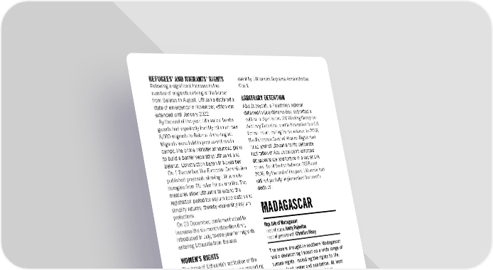 event by Lithuania’s Supreme Administrative REFUGEES’ AND MIGRANTS’ RIGHTS Following a significant increase in the Court. number of migrants arriving at the border ARBITRARY DETENTION from Belarus in August, Lithuania declared a state of emergency in November, which was Abu Zubaydah, a Palestinian national extended until January 2022. detained in Guantánamo Bay, submitted a By the end of the year, Lithuanian border petition in April to the UN Working Group on guards had reportedly forcibly returned over Arbitrary Detention, and in November to a US 8,000 migrants to Belarus since August. federal court, calling for his release. In 2018, Migrants were held in poor conditions in the European Court of Human Rights had camps.The prime minister announced plans ruled against Lithuania for its deliberate to build a barrier separating Lithuania and facilitation of Abu Zubaydah’s enforced Belarus. Construction began in November. disappearance and torture in a secret CIA On 1 December, the European Commission prison that it hosted between 2005 and published proposals allowing Lithuania to 2006. By the end of the year, Lithuania had derogate from EU rules for six months. The still not yet fully implemented the court’s measures allow Lithuania to extend the decision. registration period for asylum application and simplify returns, thereby weakening asylum protections. MADAGASCAR On 23 December, parliament voted to increase the six-month detention limit, Republic of Madagascar introduced in July, to one year for migrants Head of state: Andry Rajoelina entering Lithuania from Belarus. Head of government: Christian Ntsay WOMEN’S RIGHTS The severe drought in southern Madagascar The issue of Lithuania’s ratification of the had a devastating impact on a wide range of Council of Europe Convention on preventing human rights, including the rights to life, and combating violence against women and health, food, water and sanitation. At least domestic violence (Istanbul Convention) was 2,747 prisoners were pardoned but excluded from the parliamentary session in detention facilities remained overcrowded, March. and conditions poor. Media workers were GENDER-BASED VIOLENCE harassed for reporting on subjects such as the Covid-19 pandemic. Gender-based Domestic violence remained widespread and violence, particularly against women and was exacerbated during the Covid-19 girls, was widespread and abortion pandemic. In March, the parliamentary remained criminalized. LGBTIQ+ people Ombudsman’s Office published its 2020 continued to face discrimination. annual report, which concluded that BACKGROUND provision of assistance to victims of domestic violence was insufficient. In June, the security forces said they prevented an alleged assassination attempt LGBTI PEOPLE’S RIGHTS on President Andry Rajoelina and other In May, parliament narrowly voted against members of the government, including the debating a bill – the “partnership law” – to then minister of interior and decentralization, legalize same-sex unions. the minister of national defence and the In September, the city of Kaunas held its minister of communication and culture. first LGBTQ+ march. The local authorities, Dozens of people, including national police which had refused to issue a permit, lost an and military personnel, were investigated for appeal and were ordered to authorize the Amnesty International Report 2021/22 239