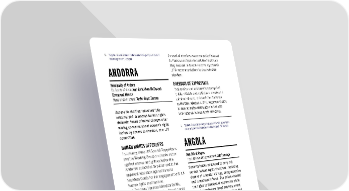 5. “Algeria: Islamic scholar sentenced to three-year prison term for in need of abortions were compelled to travel ‘offending Islam’”, 22 April to France and Spain to seek the healthcare they needed. In March Andorra rejected all ANDORRA UPR recommendations to decriminalize abortion. Principality of Andorra FREEDOM OF EXPRESSION Co-heads of state: Joan Enric Vives Sicília and Defamation and related offences against Emmanuel Macron public officials and institutions remained a Head of government: Xavier Espot Zamora criminal offence. In March the Andorran authorities rejected a UPR recommendation Access to abortion remained fully to decriminalize defamation in line with criminalized. A woman human rights international human rights standards. defender faced criminal charges after raising concerns about women’s rights, 1. “Andorra: Defamation charges against activist who raised rights including access to abortion, at a UN concerns before UN Committee must be dropped”, 16 February committee. HUMAN RIGHTS DEFENDERS ANGOLA In January, three UN Special Rapporteurs and the Working Group on discrimination Republic of Angola against women and girls called on the Head of state and government: João Lourenço Andorran authorities to put an end to the apparent retaliation against Vanessa Security forces continued to carry out Mendoza Cortés for her engagement with UN serious human rights violations, including human rights mechanisms. dozens of unlawful killings, using excessive In February, Vanessa Mendoza Cortés, and unnecessary force. The police violated president of the organization Stop Violence, the rights to freedom of expression while appeared before a judge to answer charges peaceful protesters faced arbitrary arrest brought by the public prosecutor in 2020 and detention. Pastoral communities had following a complaint by the Andorran their land expropriated for use by government as a result of her intervention at commercial farmers. The government the CEDAW Committee, and statements she responded inadequately to secure food and made in 2019 to the press, calling for the water for victims of land dispossession, decriminalization of abortion and an drought and displacement. The 1 improvement to women’s rights. The original embezzlement of state funds undermined charges against her included offences of the government’s ability to alleviate slandering the co-prince and government widespread economic hardship and address institutions. In June, the public prosecutor the failing health sector. dropped two charges of slandering with BACKGROUND prison sentences but kept the charge against the prestige of the institutions involving a fine Concerns remained over the rising cost of of up to 30,000 euros. living and Covid-19-related economic and All criminal charges against Vanessa social devastation. Public awareness of Mendoza Cortés were still pending at the end inequity, especially among the young, grew in of the year. response to the shocking contrast of images SEXUAL AND REPRODUCTIVE RIGHTS of starving people in rural areas, particularly in the southern region, and opulence in the A discriminatory and harmful total ban on capital, Luanda. While most Angolans faced abortion was still in place. As a result, people severe food shortages, the “Operation Crab” Amnesty International Report 2021/22 72