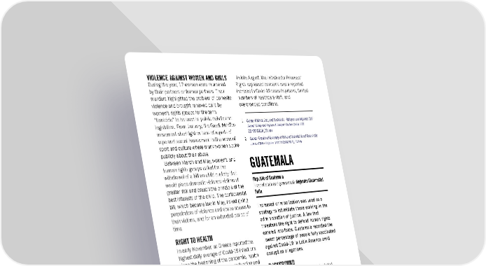 In late August, the Initiative for Prisoners’ VIOLENCE AGAINST WOMEN AND GIRLS During the year, 17 women were murdered Rights expressed concerns over a reported by their partners or former partners. Their increase in Covid-19 cases in prisons, limited murders highlighted the problem of domestic numbers of healthcare staff, and violence and brought renewed calls by overcrowded conditions. women’s rights groups for the term “femicide” to be used in public debate and 1. Greece: Violence, Lies, and Pushbacks - Refugees and Migrants Still legislation. From January, the Greek #MeToo Denied Safety and Asylum at Europe’s Borders (Index: EUR movement shed light on tens of reports of 25/4307/2021), 23 June rape and sexual harassment in the areas of 2. Greece: Freedom of Assembly at Risk and Unlawful Use of Force in the sport and culture where many women spoke Era of COVID-19 (Index: EUR 25/4399/2021), 14 July publicly about their abuse. Between March and May, women’s and human rights groups called for the GUATEMALA withdrawal of a bill on child custody that would place domestic violence victims at Republic of Guatemala greater risk and breach the principle of the Head of state and government: Alejandro Giammattei best interests of the child. The controversial Falla bill, which became law in May, risked giving perpetrators of violence and abuse access to Increased criminalization was used as a their victims, and for an extended period of strategy to intimidate those working in the time. administration of justice. A law that RIGHT TO HEALTH threatens the right to defend human rights entered into force. Guatemala recorded the In early November, as Greece reported the lowest percentage of people fully vaccinated highest daily average of Covid-19 infections against Covid-19 in Latin America amid since the beginning of the pandemic, health corruption allegations. workers’ unions called for more funding and BACKGROUND the recruitment of many more permanent staff to strengthen the weakened National US vice-president Kamala Harris visited Health System. Guatemala in June and agreed with President Concerns were raised about the punitive Giammattei to address the root causes of and discriminatory nature of a fine of €100 migration, including inequality, corruption per month imposed on people over 60 if they and the flawed rule of law. In July, the did not comply with compulsory vaccination dismissal of the head of the Special for Covid-19, following the adoption of a legal Prosecutor’s Office Against Impunity sparked provision by the parliament in early nationwide protests against corruption, December. economic inequality and the government’s response to Covid-19. DETAINEES’ RIGHTS IMPUNITY In January, Dimitris Koufondinas, a member of armed group Revolutionary Organization Those working in the administration of justice 17 November, began a hunger strike to with key roles in the fight against impunity in protest against the government’s decision to cases of serious human rights violations and transfer him to Domokos prison and not to corruption were removed from or prevented Korydallos prison in accordance with national from taking up their posts and faced threats, 1 legislation. Despite a significant deterioration criminal prosecution and smear campaigns. in his health, the authorities refused to In April, magistrate Gloria Porras, a accept his request. In March, Dimitris prominent supporter of human rights and Koufondinas ended his hunger strike. anti-corruption efforts in recent years, who Amnesty International Report 2021/22 181