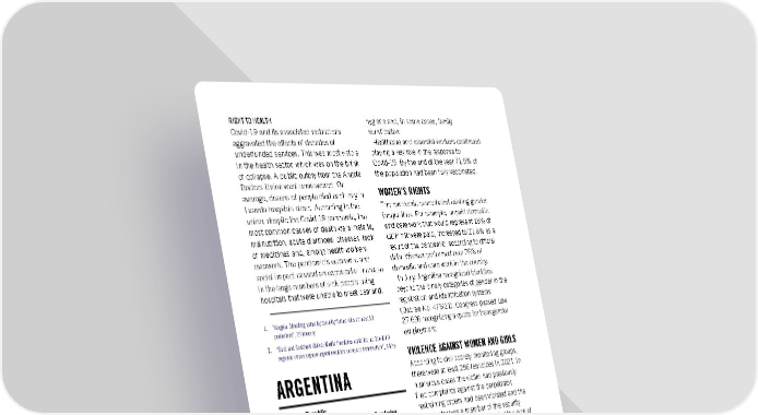 RIGHT TO HEALTH hygiene and, in some cases, family Covid-19 and its associated restrictions reunification. aggravated the effects of decades of Healthcare and essential workers continued underfunded services. This was most visible playing a key role in the response to in the health sector, which was on the brink Covid-19. By the end of the year 71.9% of of collapse. A public outcry from the Angola the population had been fully vaccinated. Doctors Union went unanswered. On average, dozens of people died each day in WOMEN’S RIGHTS Luanda hospitals alone. According to the The pandemic exacerbated existing gender union, despite the Covid-19 pandemic, the inequalities. For example, unpaid domestic most common causes of death were malaria, and care work that would represent 16% of malnutrition, acute diarrhoeal diseases, lack GDP if it were paid, increased to 21.8% as a of medicines and, among health workers, result of the pandemic, according to official overwork. The pandemic’s economic and data. Women performed over 76% of social impact caused an exponential increase domestic and care work in the country. in the large numbers of sick people using In July, Argentina recognized identities hospitals that were unable to meet demand. beyond the binary categories of gender in the registration and identification systems 1. “Angola: Shooting spree by security forces kills at least 10 (Decree No. 476/21). Congress passed Law 27,636 recognizing a quota for transgender protesters”, 2 February 2. “East and Southern Africa: Media freedoms curtailed as Covid-19 employment. regional crises expose urgent need for access to information”, 3 May VIOLENCE AGAINST WOMEN AND GIRLS According to civil society monitoring groups, ARGENTINA there were at least 256 femicides in 2021. In numerous cases the victim had previously Argentine Republic filed complaints against the perpetrator, Head of state and government: Alberto Fernández restraining orders had been violated and the perpetrator was a member of the security The Covid-19 pandemic continued to forces. These cases demonstrated the lack of exacerbate existing inequalities amid the effective public policies and measures to country’s ongoing economic crisis. Violence address gender-based violence and the against women and girls and the lack of absence of a gender perspective among law effective measures to address it remained a enforcement officials. serious concern. There were challenges Sex workers’ movements reported an regarding implementation of the 2020 law increase in harassment and arbitrary legalizing abortion. Impunity persisted for detentions by the City of Buenos Aires enforced disappearances and excessive use security forces in the context of Covid-19 of force by law enforcement officials. restrictions. BACKGROUND SEXUAL AND REPRODUCTIVE RIGHTS The country’s profound economic and social During the first year after Congress approved crisis continued. According to official figures, the law for the decriminalization and by June, 40.6% of the population was living legalization of abortion within the first 14 in poverty and the unemployment rate was weeks of pregnancy, challenges persisted 8.6% in the third trimester of the year. over implementation. No jurisdiction, either Strict controls on movement, reinstated in national or local, undertook a mass campaign response to the second wave of Covid-19, left to provide information on access to abortion. hundreds of Argentinians stranded abroad, There were reports of abusive use of without access to adequate healthcare or conscientious objection clauses, delays in Amnesty International Report 2021/22 75